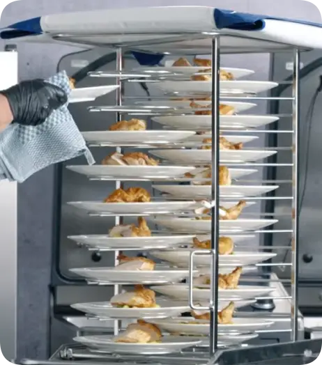 V kuchyních fungujících v systému předběžné přípravy – jako je cook & chill – jsou klíčová zařízení pro regeneraci pokrmů nebo konvekčně-parní pece s funkcí regenerace. Umožňují rychlý a kontrolovaný ohřev vychlazených jídel bez ztráty jejich kvality. Díky automatickým programům je tento proces opakovatelný, bezpečný a v souladu s požadavky HACCP.