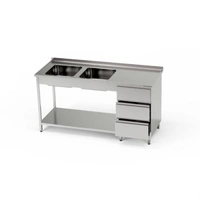 Nerezový stůl s dvoumiskovým dřezem a blokem se 3 zásuvkami a policí 190x70x85 cm | FORGAST