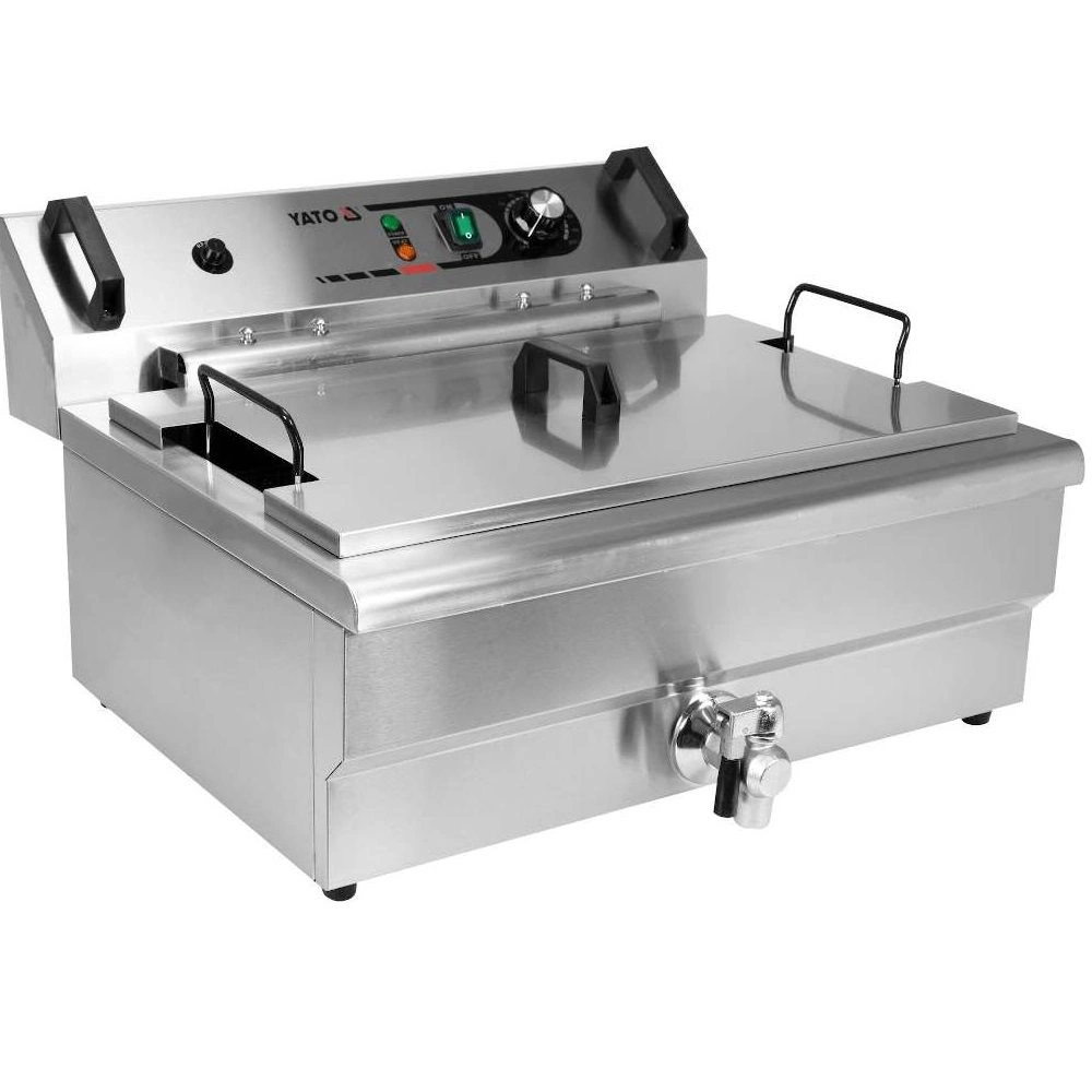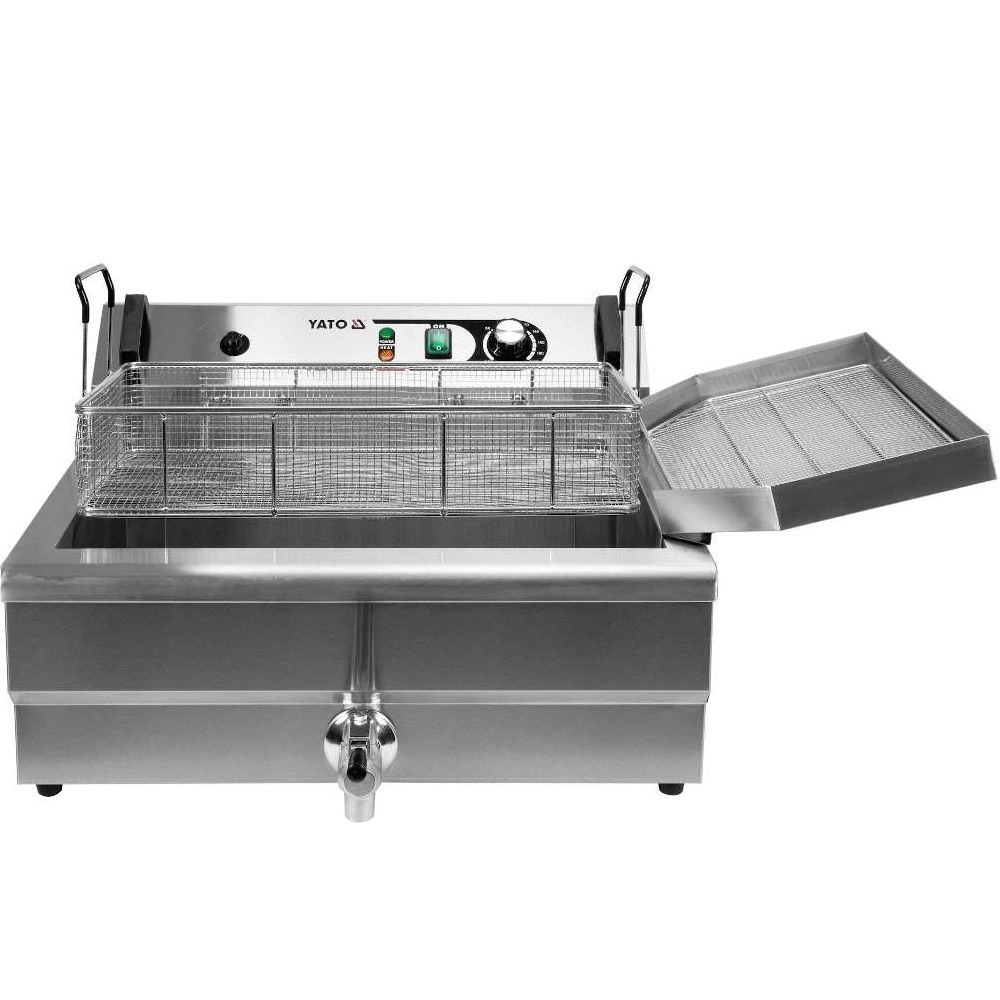 Elektrická fritéza YATO YG-04640 - určená pro smažení produktů ve velkém množství tuku, např. masa, ryb, zeleniny, koblih nebo kroket. Celkový objem nádrže fritézy je 30 l – minimální hladina oleje je 17 l a maximální 23 l. Fritéza je vybavena topným tělesem o výkonu 6,0 kW, které je ovládáno pomocí potenciometru umístěného na ovládacím panelu. Pracovní teplota 60oC - 200oC. Díky stříkavě odolnému vypínači lze zařízení vypnout bez nutnosti odpojování napájecího kabelu ze sítě.