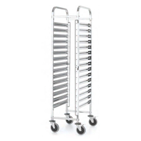 WózekNavrženo pro přepravu až 15 nádob GN 1/1. Konstrukce z nerezové oceli, snadno se udržuje v čistotě. Uspořádání skluzavek umožňuje přepravu různých konfigurací kontejnerů GN 1/1, GN 1/2, GN 1/3. Na konci skluzavek je protiskluzová ochrana. Vzdálenost mezi kolejnicemi je 8 cm. Snadné manévrování s jednotkou umožňují 4 gumové nožičky o průměru 10 cm a 2 brzdy.