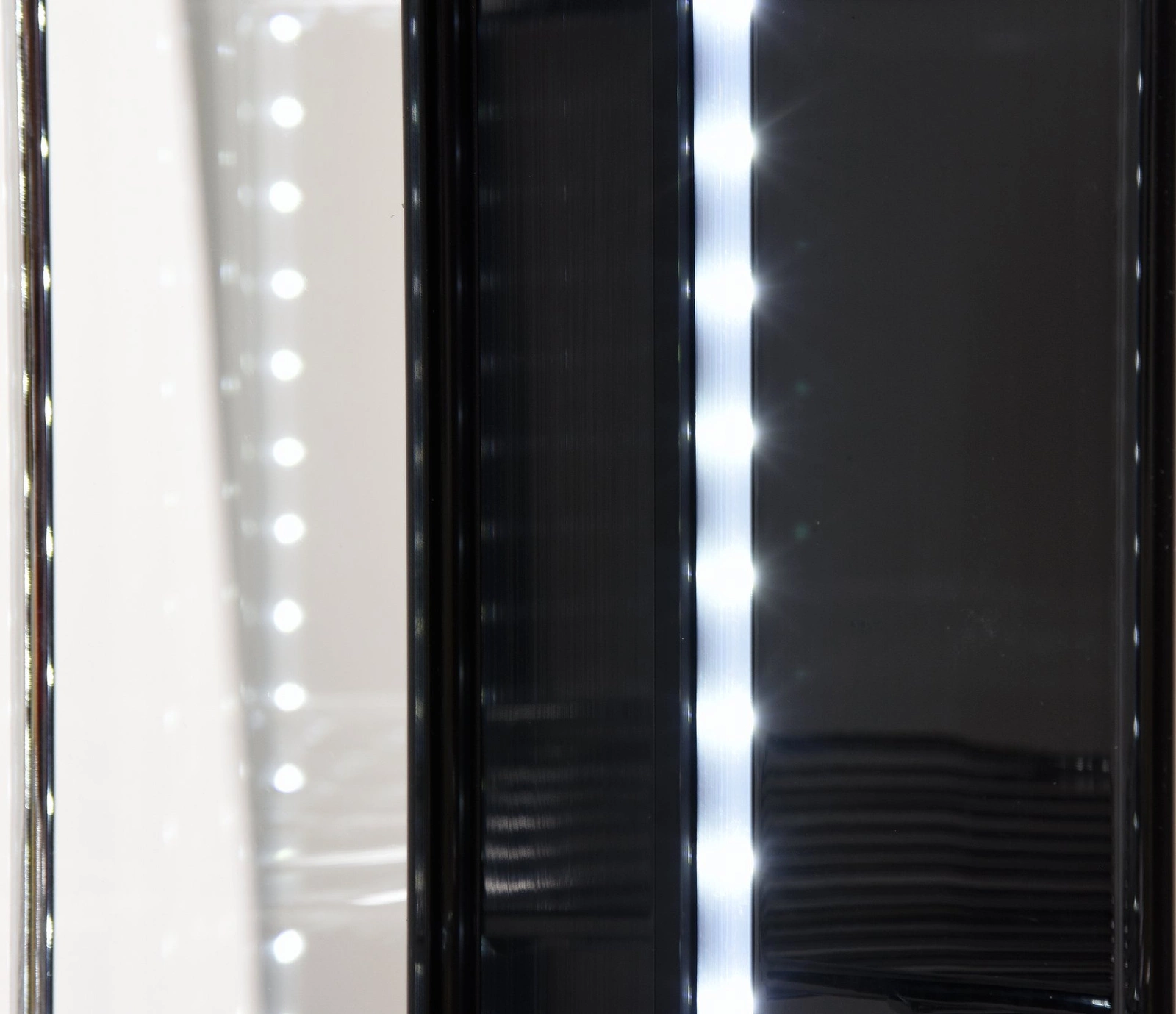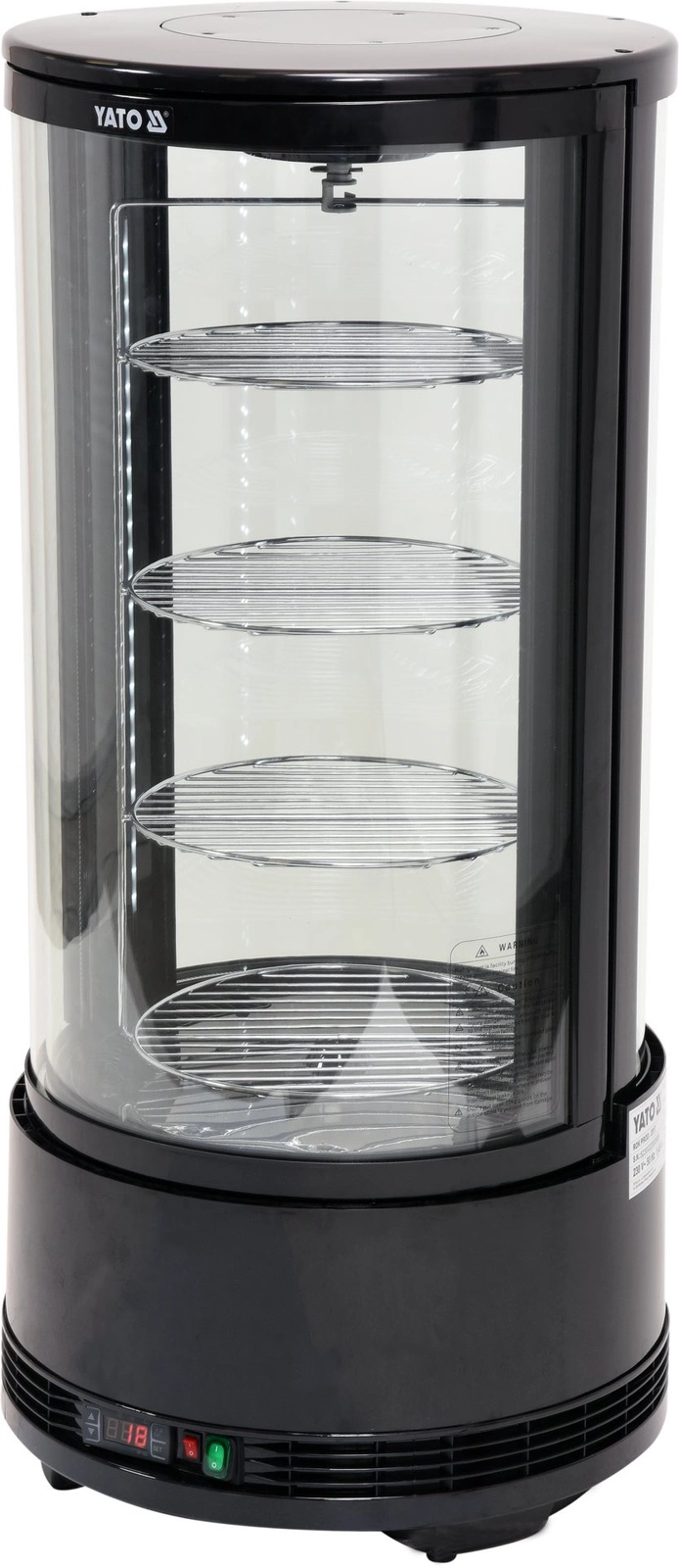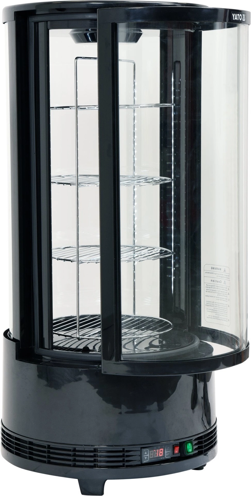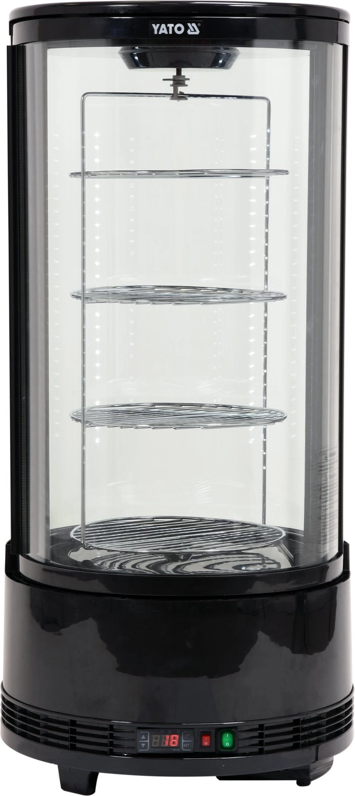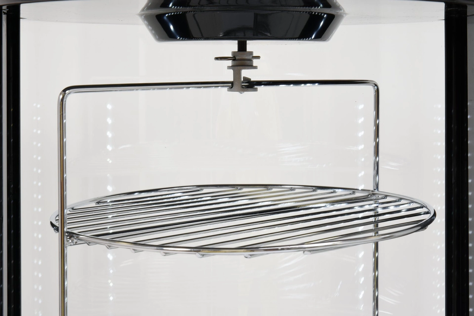 Kulatá chladicí vitrína s objemem 73 l. Černá barva. Vyrobena z vysoce kvalitních surovin. Ideální pro vystavování dortů a zákusků. Součástí jsou 4 police z tvrzeného skla s nastavitelnou výškou. Přístup do vitríny je zajištěn skleněnými dvířky z tvrzeného skla s funkcí samouzavírání. Vitrína má oboustranné LED osvětlení. Chladicí agregát využívá chladivo 600a. Zařízení má elektronický ovladač s digitálním displejem teploty.