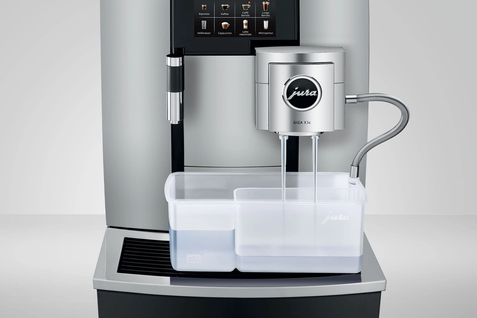 Automatický kávovar GIGA X3c od společnosti JURA ve stříbrno-černé barvě. Skvěle se hodí do větších kanceláří, zasedacích místností, kávových koutků v obchodech nebo na nádražích. Kávovar je určen pro přípravu přibližně 150 šálků kávy denně. Díky použití zcela nových vnitřních komponentů je model GIGA X3c robustnější, účinnější, inteligentnější a snadněji se servisuje a hygienicky udržuje. Vestavěný elektronicky řízený keramický mlýnek navíc zajišťuje neuvěřitelnou životnost zařízení a důsledně rovnoměrné mletí zrn. Pulzní extrakční proces (P.E.P.®) dokonale reguluje dobu přípravy ristretta a espressa. Kávovar je standardně vybaven funkcí One-Touch pro automatické čištění mléčného systému a nastavitelnou (5-16 g) spařovací jednotkou. Přístroj má 2 systémy ohřevu termobloku, 2 systémy cirkulace vody, systém mléka / vyměnitelnou koncovkuópro napěňovací trysku HP3 / CX2, dávkovač mleté kávy. Kromě toho je vybaven integrovaným programem oplachování, čištění a odstraňování vodního kamene s hygienickou normou JURA: certifikát TÜV.