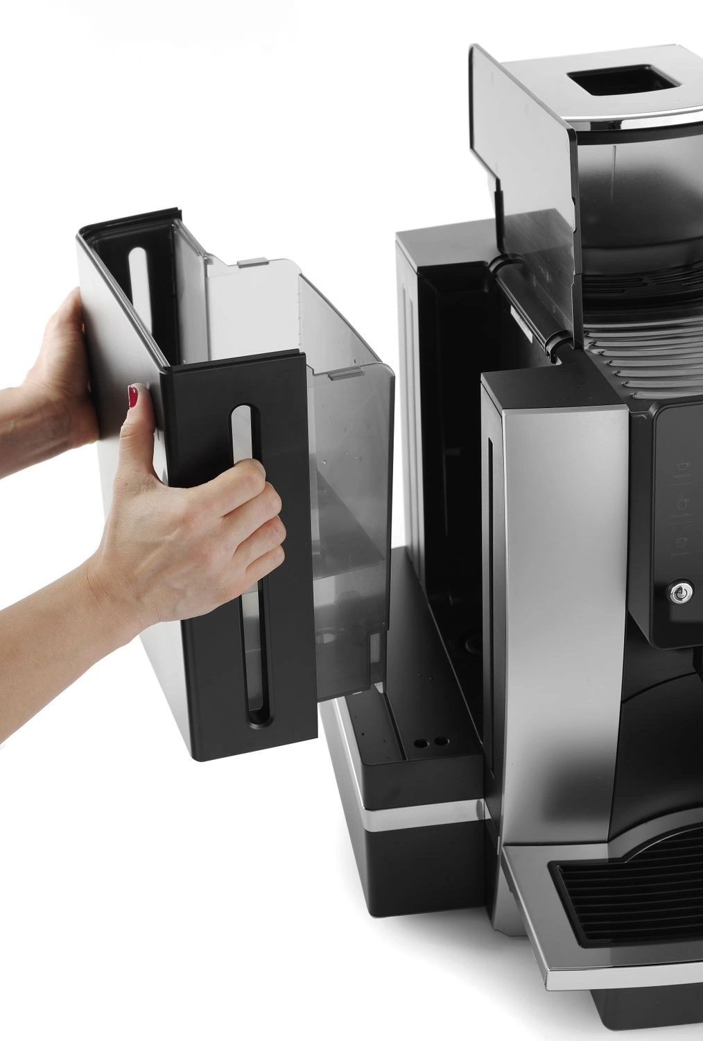 • Integrovaný velkokapacitní zásobník na vodu a kávový odpad – umožňuje dlouhodobý provoz bez nutnosti častého vyprazdňování nebo doplňování.