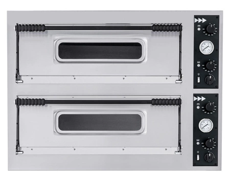 Elektrická dvoustěnná pec na pizzu Basic XXL 66 Značka Hendi se ovládá ručně. Stroj dokáže současně upéct 6 pizz o průměru 35 cm. Pec se doporučuje pro malé gastronomické zařízení. Přední část z nerezové oceli, ocelový plášť, izolace z minerální vlny.