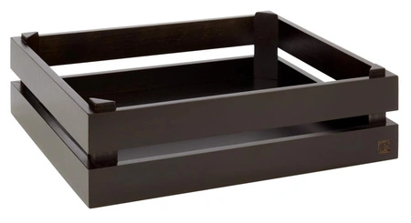 Produkt je vyroben z vysoce kvalitního dřeva, což mu zajišťuje stabilitu a dlouhou životnost. Pečlivě upravený povrch v černé barvě dodává eleganci a snadno se kombinuje s dalšími prvky bufetového vybavení. Přepravka byla navržena tak, aby ji bylo možné používat dvěma způsoby – jak jako klasickou přepravku, tak i jako praktickou základnu pro GN nádoby.