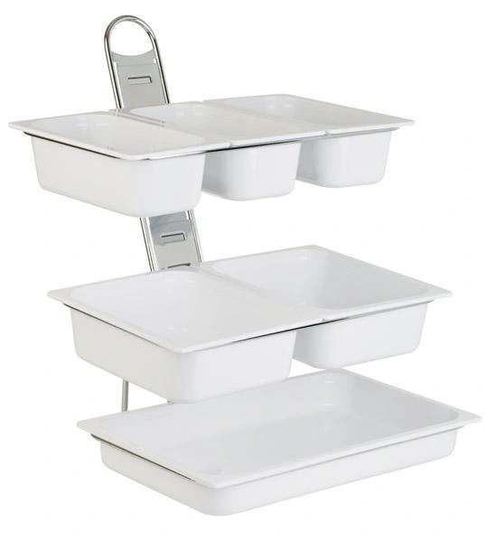 Pevná kovová konstrukce stojanu zajišťuje stabilitu při používání a chromovaný povrch chrání před korozí a usnadňuje údržbu čistoty. Stojan je navržen s ohledem na gastronádoby GN 1/1, což jej činí mimořádně univerzálním a kompatibilním s profesionálním kuchyňským vybavením. Díky promyšlenému tvaru produkt umožňuje lépe využít prostor na stole a zvýšit atraktivitu prezentovaných jídel.