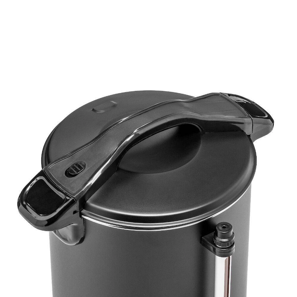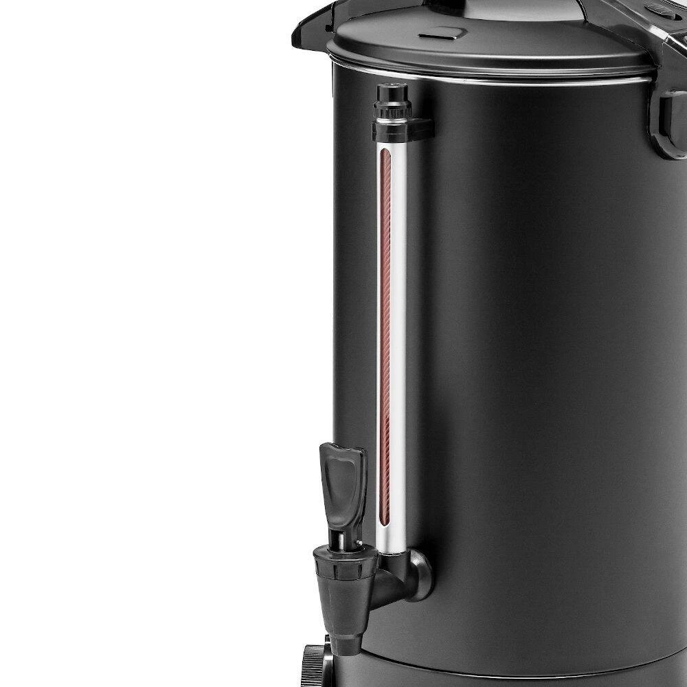 Zařízení je vyrobeno z vysoce kvalitní nerezové oceli uvnitř, zatímco vnější plášť je pokryt odolnou matnou černou barvou. Kávovar je vybaven uzamykatelným víkem proti náhodnému otevření, bočními madly a držadlem víka z odolného polypropylenu, které se nezahřívají, a nekapkajícím kohoutkem, který zaručuje pohodlné a čisté nalévání nápoje. Přehledný ukazatel hladiny umožňuje průběžnou kontrolu množství kávy a odkapávací miska v sadě chrání pracovní plochu před znečištěním. Kontrolky informují o provozu zařízení a udržování teploty. To vše činí kávovar vynikajícím řešením jak pro profesionální kuchyně, tak pro obsluhu velkých akcí či firemních setkání.