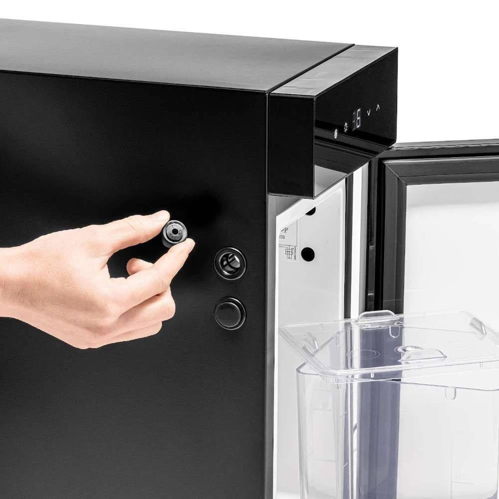 - Dva univerzální otvory na hadičku – umožňují připojení lednice ke kávovaru z libovolné strany, což usnadňuje umístění zařízení na jakémkoli pracovišti a zajišťuje automatické odebírání mléka při přípravě mléčných káv.