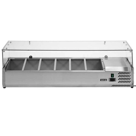 Chladicí zásobník 6x1/3 GN s rovným oknem z tvrzeného skla z nerezové oceli. Vnitřní a vnější plášť z nerezové oceli ss202. Statické chlazení s funkcí automatického odmrazování. Boční chladicí jednotka značky Zanussi 110 W, chladivo R600a Vitrína je vhodná pro GN nádobyós maximální hloubkou 15 cm. Jednotka má teplotní rozsah +2 až +8 stupňů a je řízena elektronickým regulátorem s displejem.