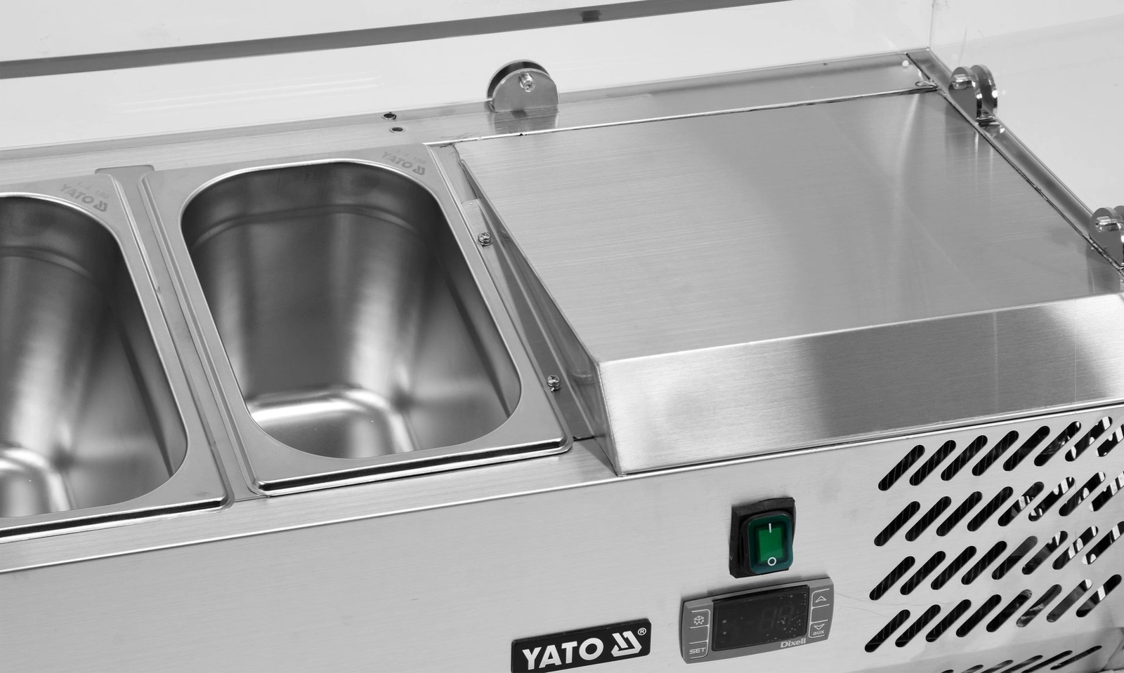 Chladicí tác 7x1/4 GN s rovným oknem z tvrzeného skla z nerezové oceli. Vnitřní a vnější plášť z nerezové oceli ss202. Statické chlazení s funkcí automatického odmrazování. Boční chladicí jednotka značky Zanussi 110 W, chladivo R600a Vitrína je vhodná pro GN nádobyós maximální hloubkou 15 cm. Jednotka má teplotní rozsah +2 až +8 stupňů a je řízena elektronickým regulátorem s displejem.
