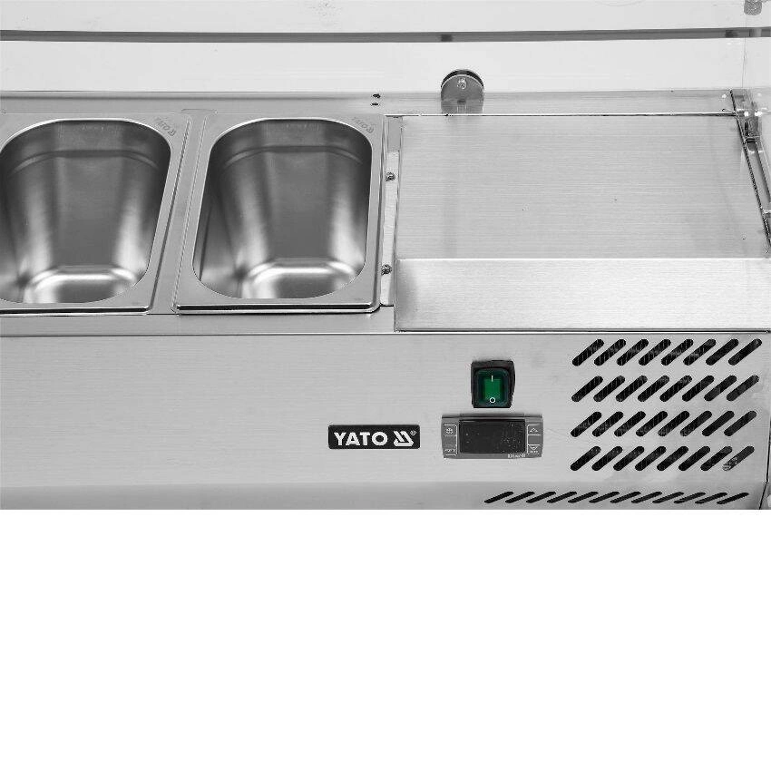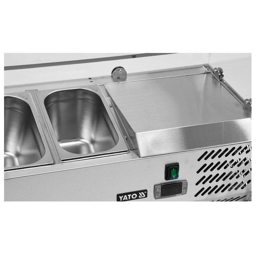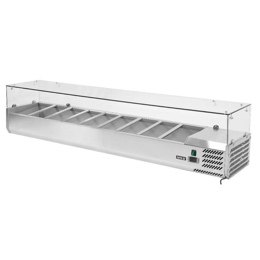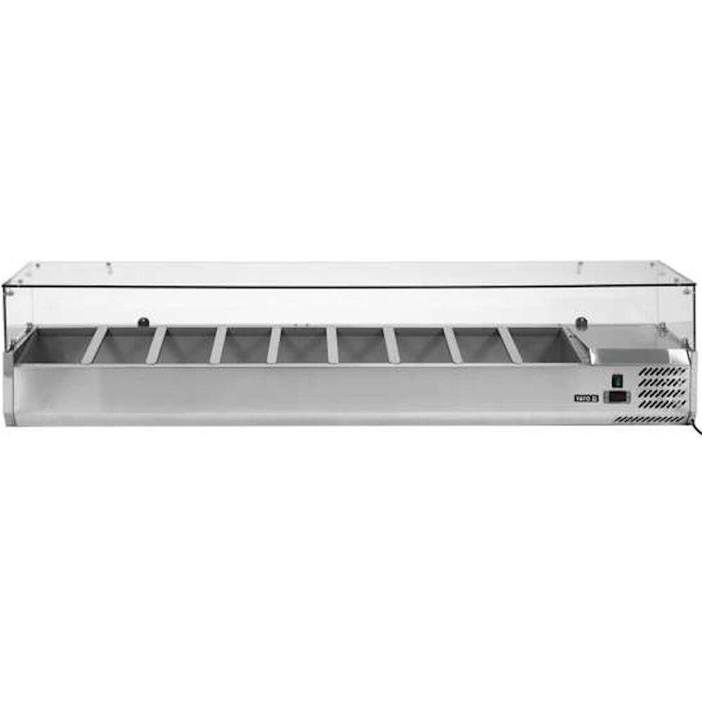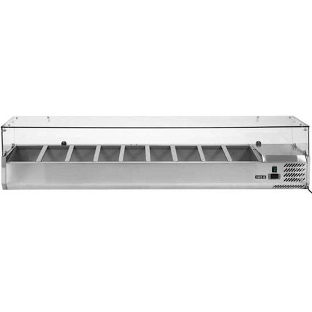 Chladicí zásobník s kapacitou 9x1/3 GN s rovným oknem z tvrzeného skla z nerezové oceli. Vnitřní a vnější plášť z nerezové oceli ss 202. Statické chlazení s funkcí automatického odmrazování. Boční chladicí jednotka značky Zanussi 110 W, chladivo R600a Vitrína je vhodná pro GN nádobyós maximální hloubkou 15 cm. Přístroj pracuje v teplotním rozmezí +2 až +8 stupňů, regulace teploty probíhá pomocí elektronického regulátoru s displejem.