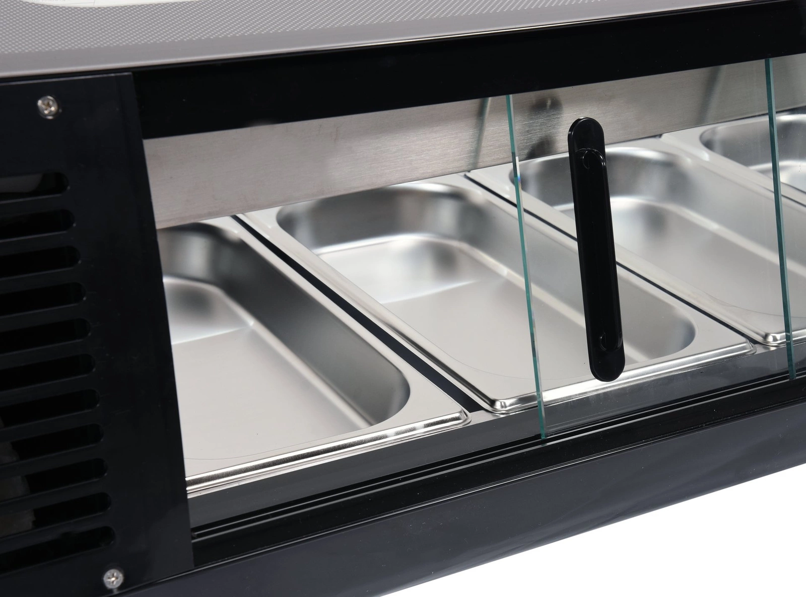 Chladicí vitrína na sushi 4x1/3 GN. Dodává se se 4 nádobami z nerezové oceli o velikosti 4 x 1/3 GN. Posuvná dvířka z tvrzeného skla umožňují přístup do přihrádky. Zaoblené přední sklo rovněž z tvrzeného skla, nad nímž je LED osvětlení. Chladivo R600a, teplotní rozsah 0-12 o C. Statické chlazení s funkcí automatického odmrazování. Elektrický regulátor s ukazatelem teploty.