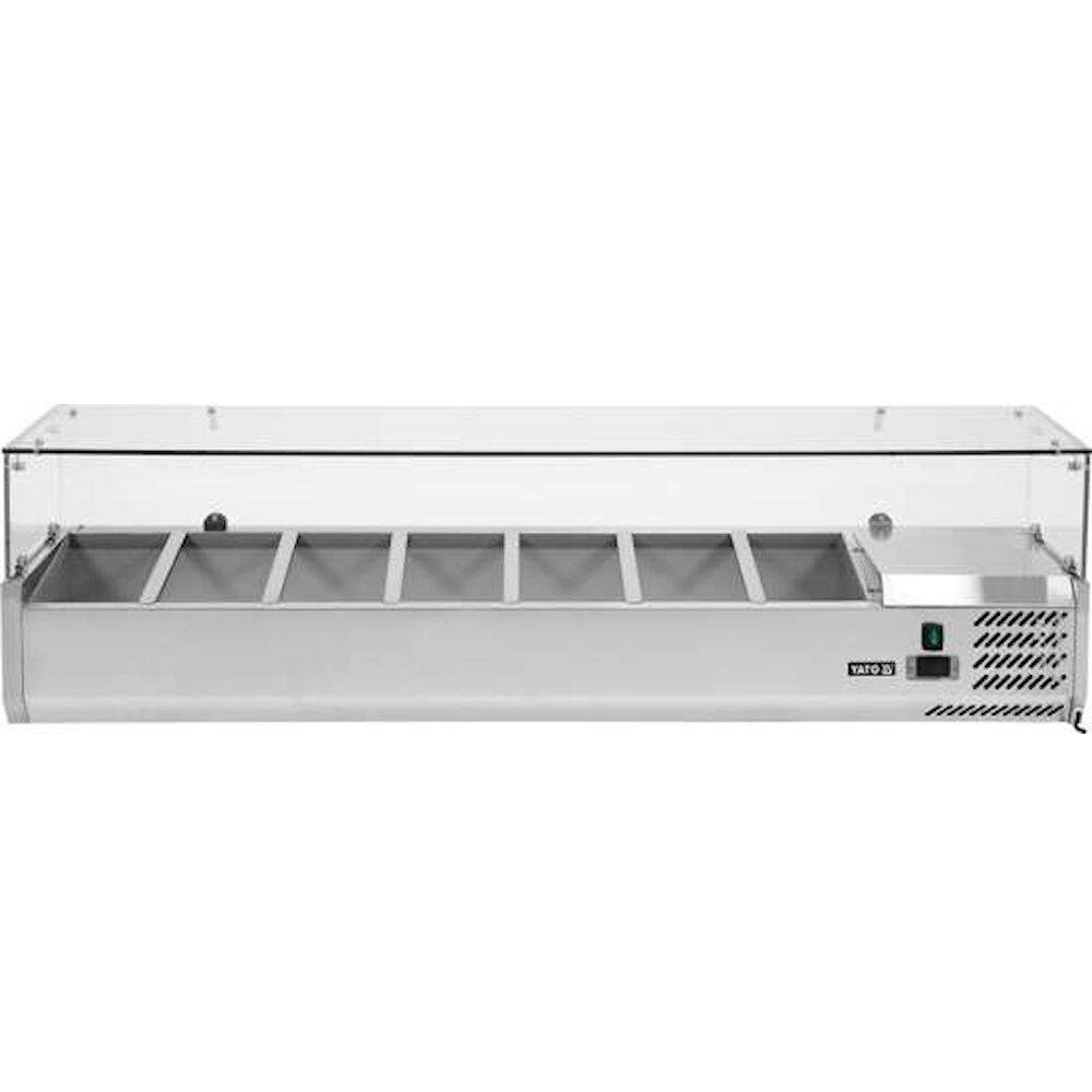 Chladicí nástavec s kapacitou 7x1/3 GN s rovným oknem z tvrzeného skla z nerezové oceli. Vnitřní a vnější plášť z nerezové oceli ss202. Statické chlazení s funkcí automatického odmrazování. Boční chladicí jednotka značky Zanussi 110 W, chladivo R600a Vitrína je vhodná pro GN nádobyós maximální hloubkou 15 cm. Jednotka pracuje v teplotním rozmezí +2 až +8 stupňů. Regulace teploty se provádí pomocí elektronického regulátoru s displejem.