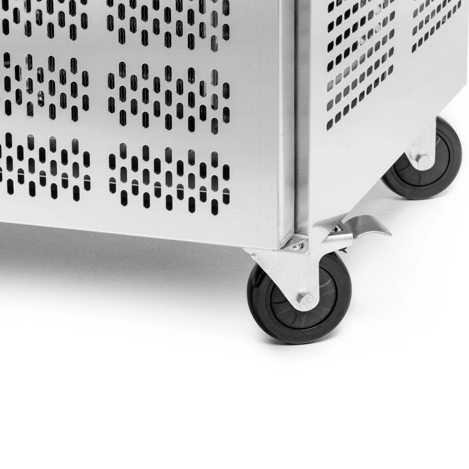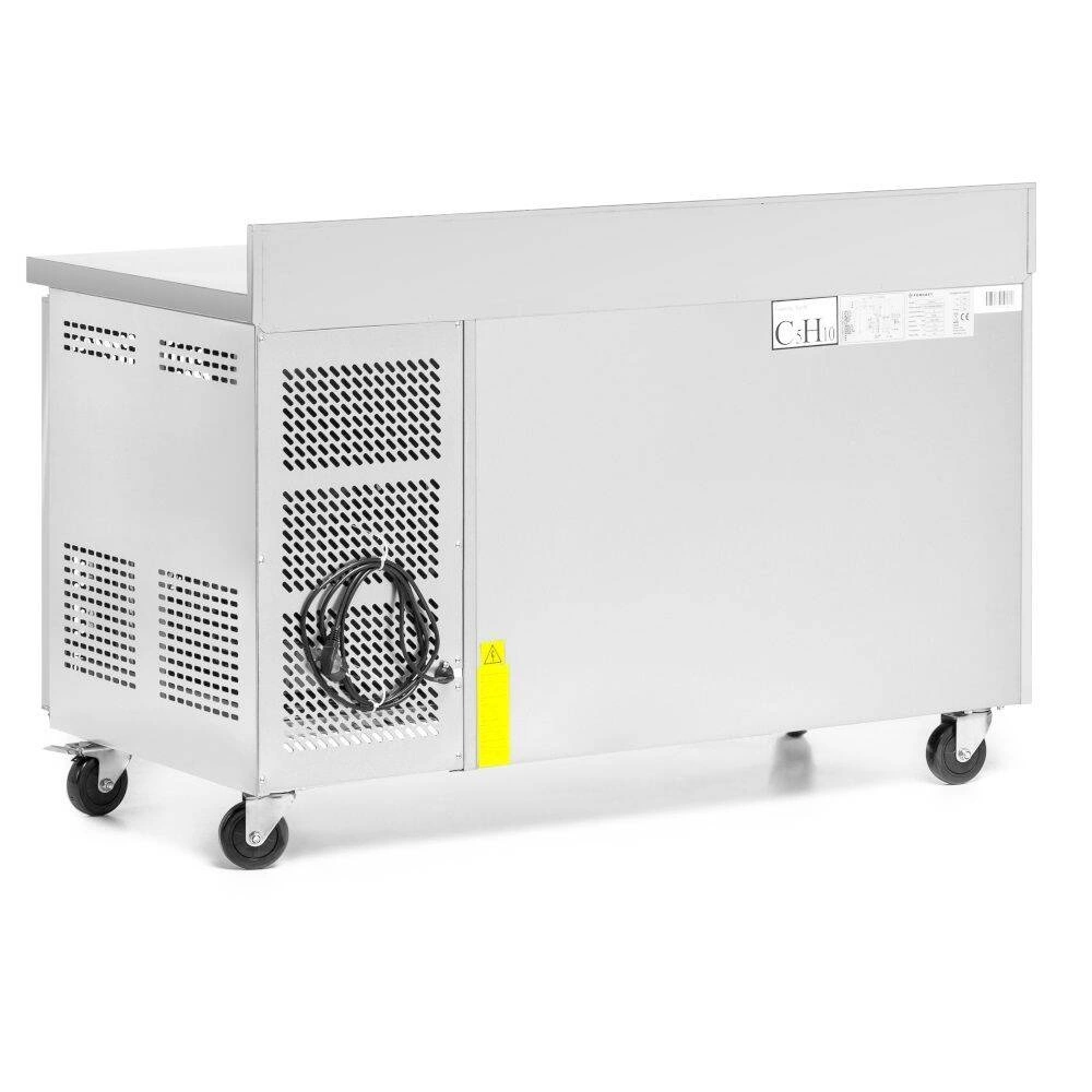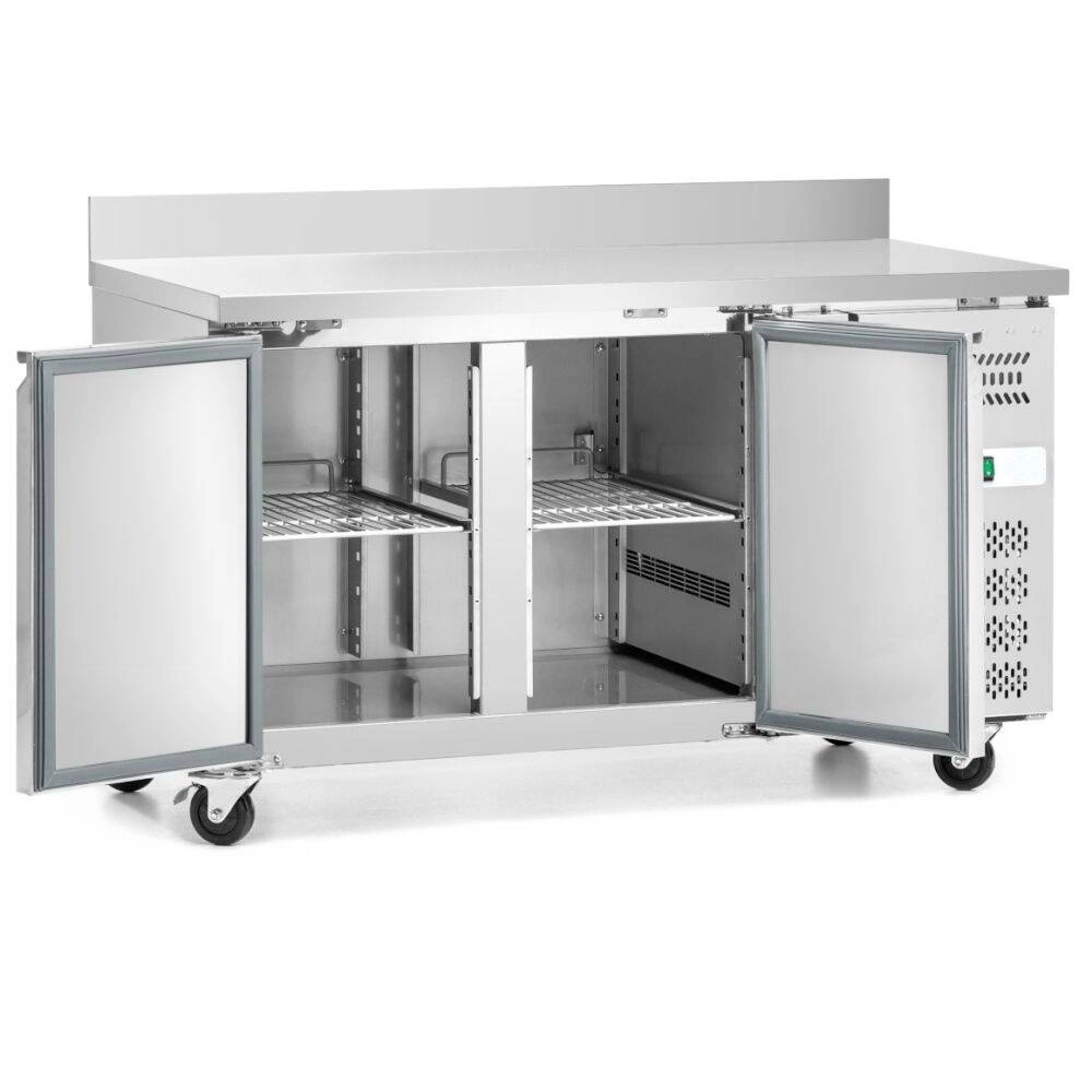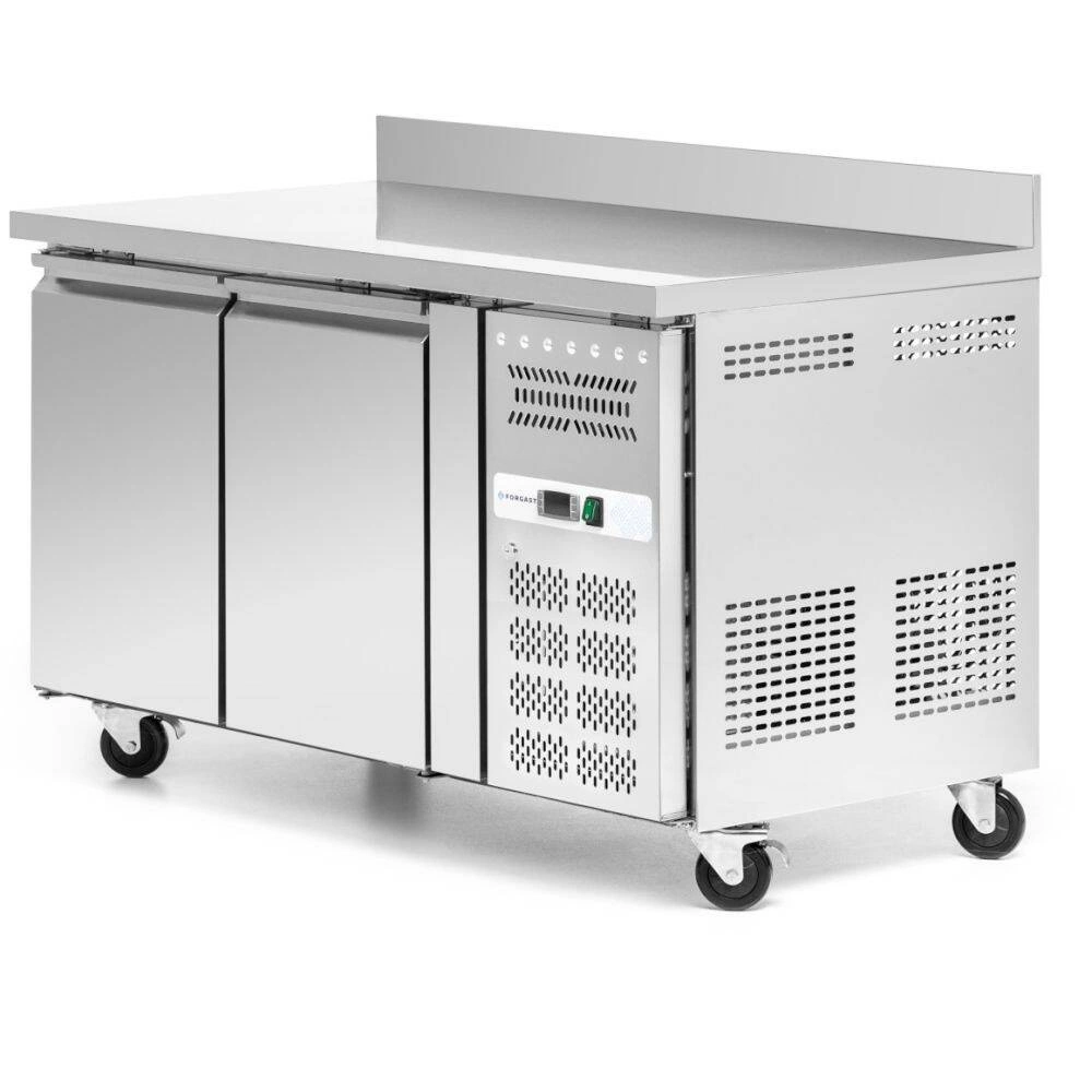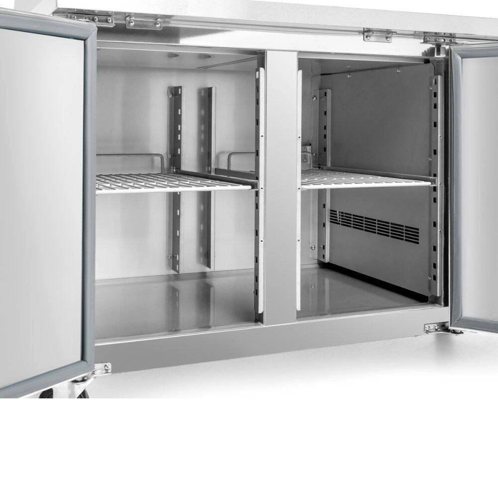Chladicí stůl je vybaven pracovní deskou z nerezové oceli se zadním lemem o výšce 10 cm, který zabraňuje padání produktů během práce. Zaoblené rohy komory usnadňují udržování čistoty, což je důležité při každodenním používání. Vnitřní prostor je rozdělen na dvě prostorné komory, z nichž každá má polici pro organizaci uložených produktů. Snadno vyjímatelné těsnění dveří umožňuje rychlé čištění a údržbu. Boční agregát zajišťuje volný přístup k celé pracovní ploše stolu a automatické odtávání minimalizuje potřebu ručních zásahů.