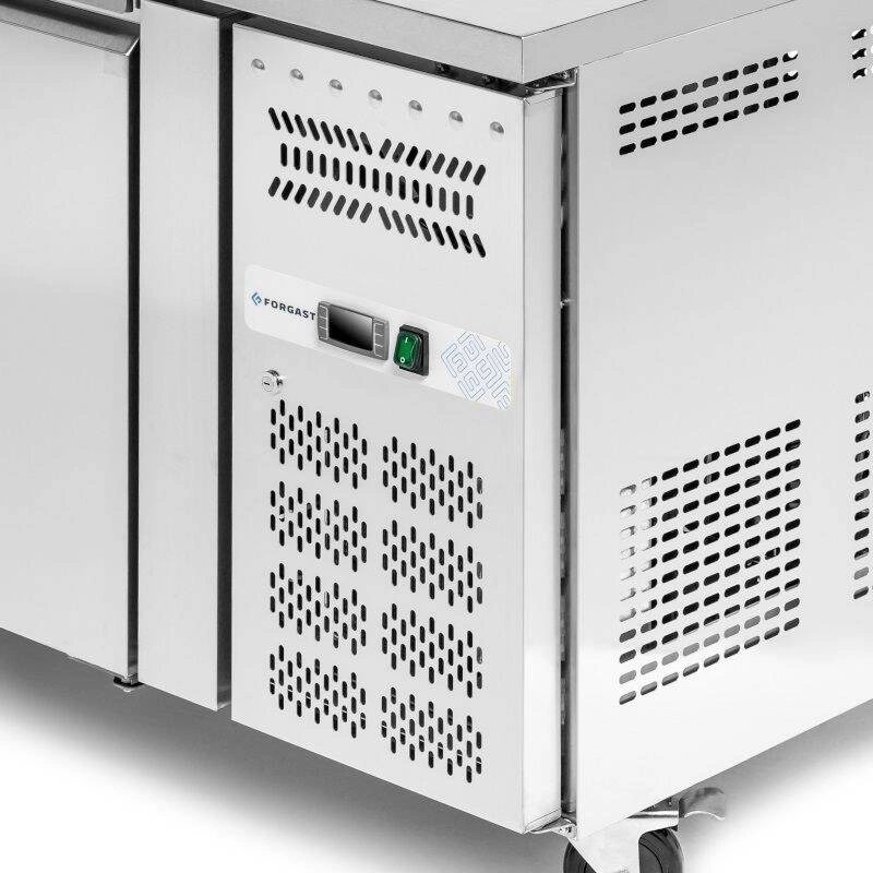 Chladicí stůl FORGAST FG07122 se skvěle hodí do profesionálních kuchyní, restaurací, rychlých občerstvení i cateringových firem. Umožňuje nejen skladování produktů v optimálních teplotních podmínkách, ale také přípravu jídel přímo na pracovní desce. V sadě jsou dvě police a ke stolu lze dokoupit další příslušenství jako FG07125 a FG07127, které umožňují ještě lepší přizpůsobení zařízení individuálním potřebám uživatele.