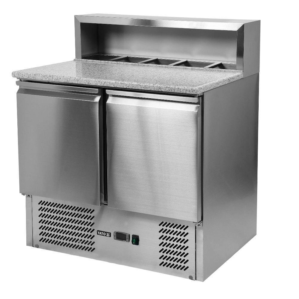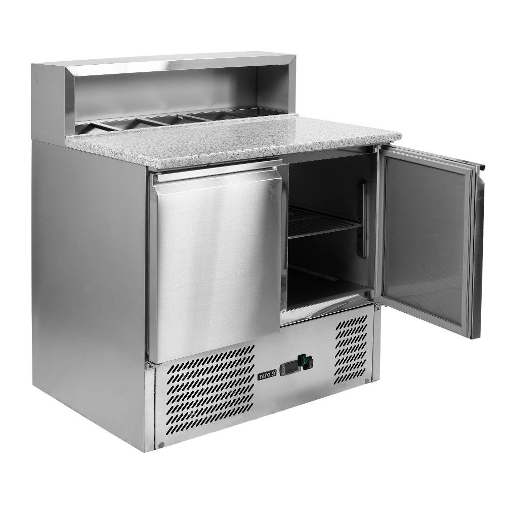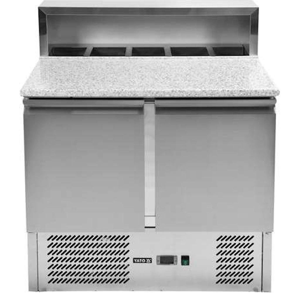 Chladicí stůl na pizzu 2-dveřový s nástavcem YATO YG-05275 je profesionální gastronomické zařízení určené k přípravě a uchovávání surovin na pizzu. Vyznačuje se pevnou konstrukcí z nerezové oceli, mramorovou pracovní deskou a praktickým chladicím nástavcem. Ideální volba pro pizzerie, restaurace a gastronomické provozy, kde je důležitá efektivita práce a zachování čerstvosti produktů.