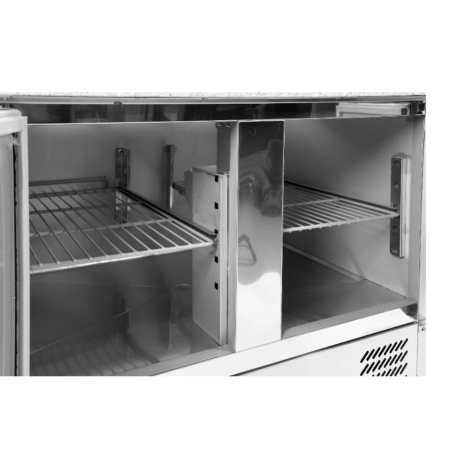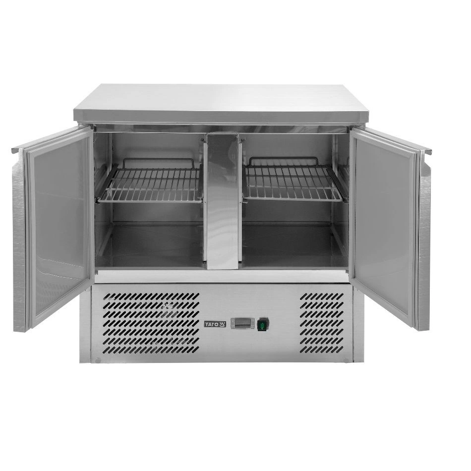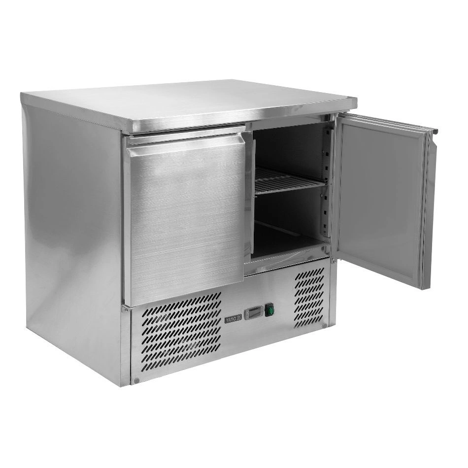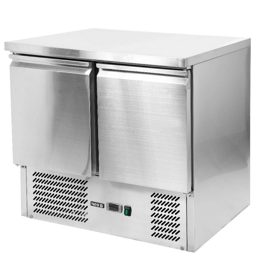 Chladicí stůl 2-dveřový značky YATO – řada 700 o rozměrech 90x70x87cm a objemu 240l. Plášť a pracovní deska jsou vyrobeny z nerezové oceli ss201. Samozavírací dveře jsou vybaveny zámkem. Součástí vybavení jsou 2 roštové police (po jedné na dveře) potažené PVC s maximální nosností 40 kg – při rovnoměrném zatížení. Chladicí komora ve standardu 1/1 GN.