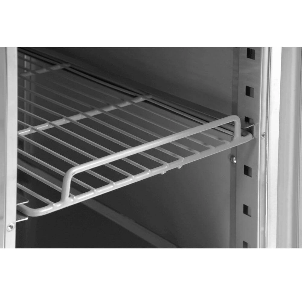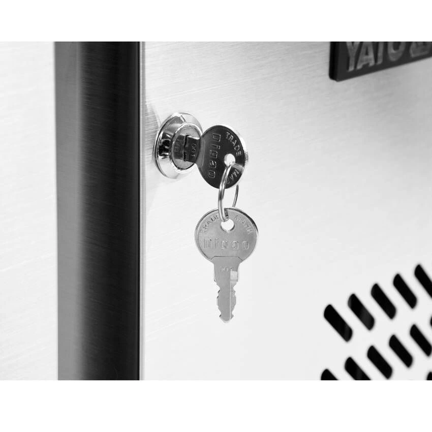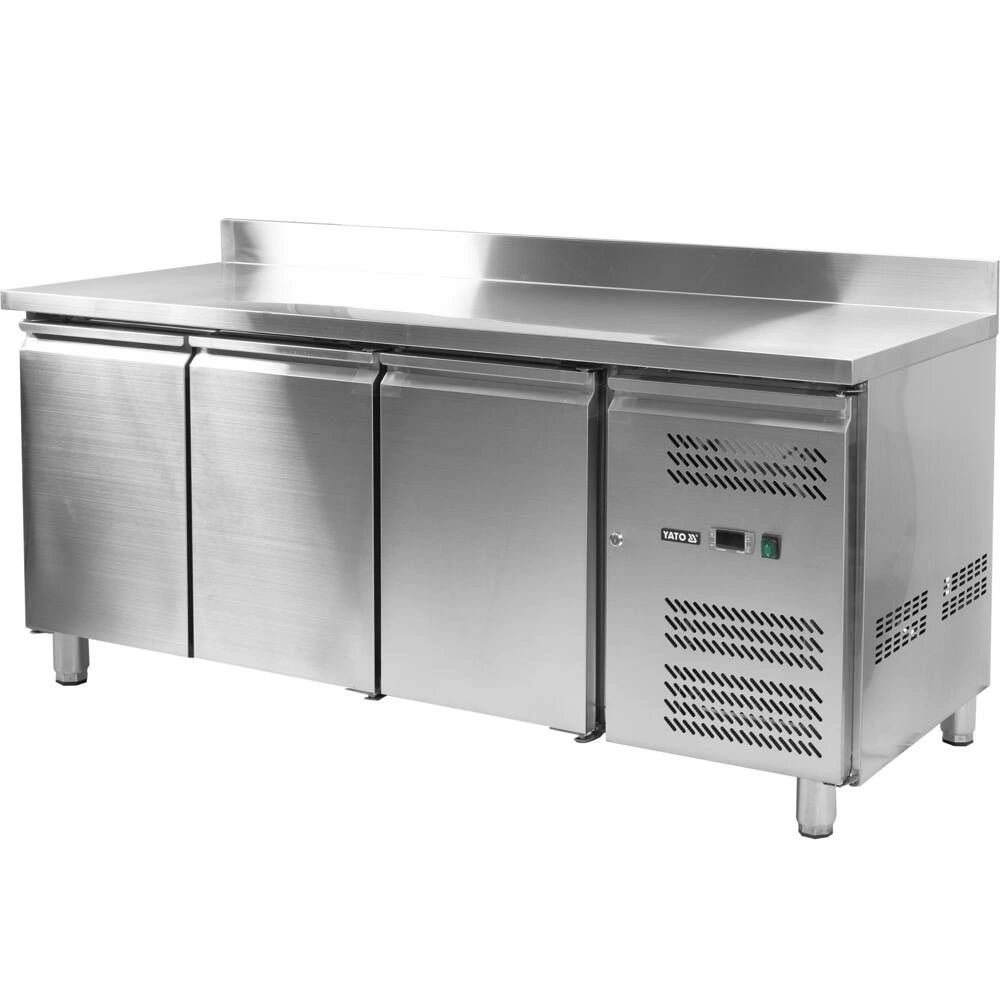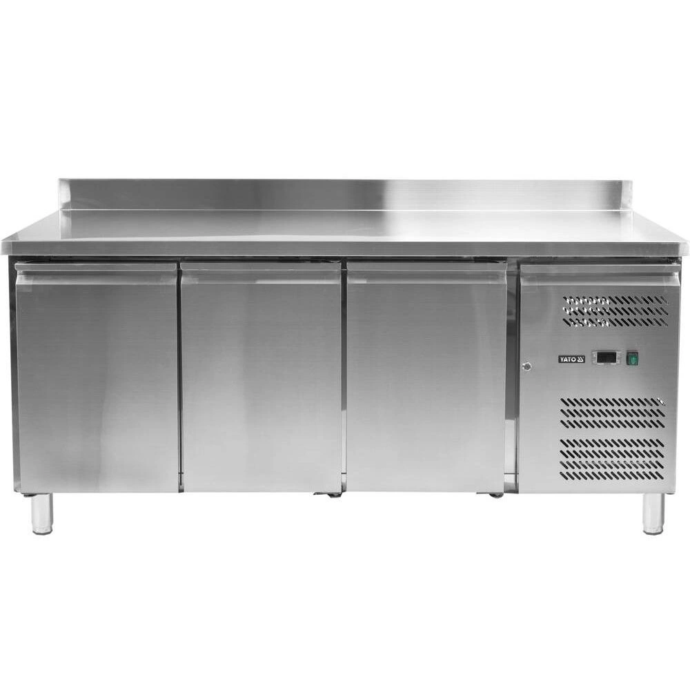 Chladicí stůl 3-dveřový s lemem značky YATO  o rozměrech pracovní desky 179,5x70x95 cm a objemu 417 l. Navržený pro skladování potravin v teplotním rozsahu od -2°C do +80°C. Vnější a vnitřní plášť je vyroben z vysoce kvalitní nerezové oceli SS201, což zajišťuje elegantní vzhled a zároveň velmi snadnou údržbu čistoty. Pracovní deska má zadní lem o výšce 10 cm. Stůl je vybaven 4 nohami s nastavitelnou výškou v rozmezí 12~18 cm. Stůl je vybaven třemi výklopnými, samouzavíracími dveřmi s ergonomickými madly a každé dveře mají v sadě jednu roštovou polici potaženou PVC s maximální nosností 40 kg při rovnoměrném zatížení. Tento model umožňuje také skladování GN 1/1 nádob.