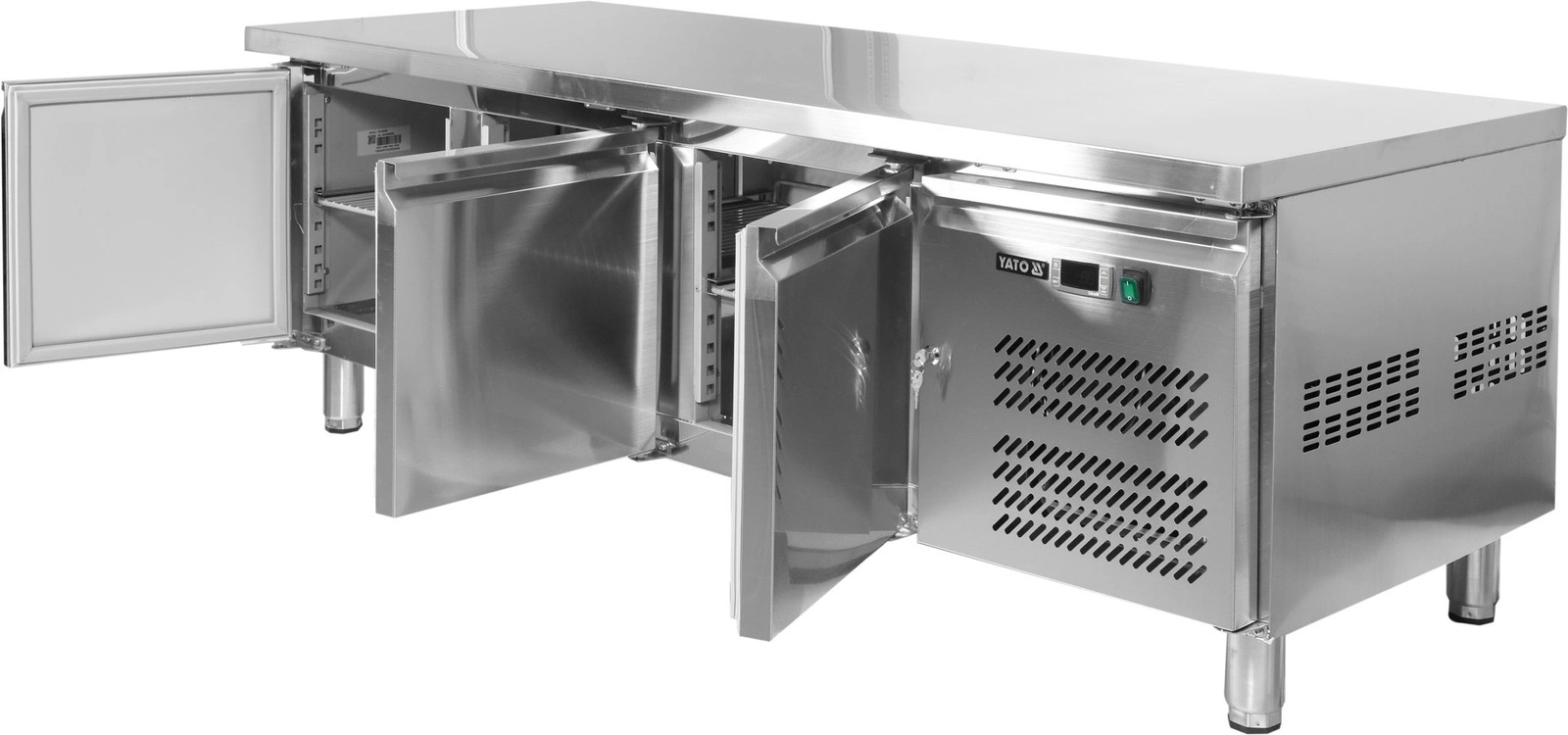 Chladicí stůl 3-dveřový o objemu 317 l značky YATO. Stůl s rozměry pracovní desky 179,5x70 cm, s nastavitelnou výškou v rozmezí 65-72 cm. Navržený pro skladování potravin v teplotním rozsahu od -2°C do +8°C. Vnější a vnitřní plášť z vysoce kvalitní nerezové oceli 201 zaručuje elegantní vzhled a zároveň je velmi snadný na údržbu a čištění. Stůl je vybaven 4 nožkami s nastavitelnou výškou v rozmezí 14-20 cm.