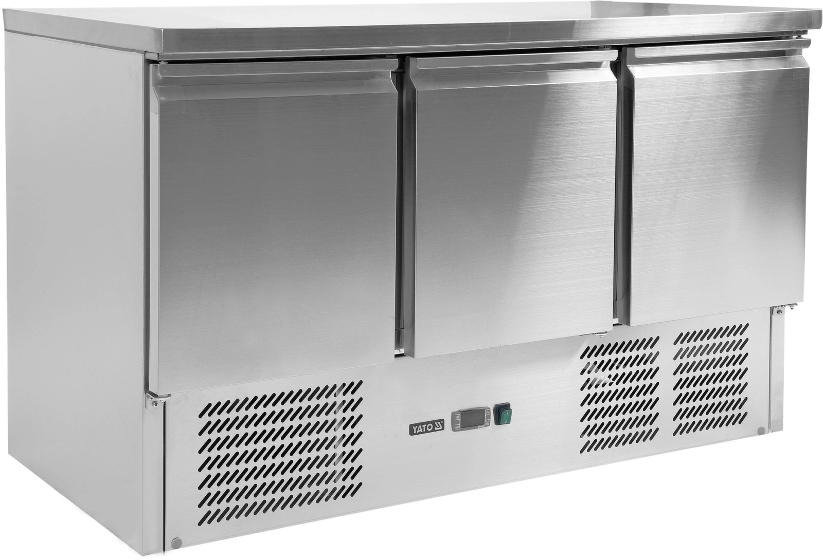 Chladicí stůl 3-dveřový značky YATO – řada 700 o rozměrech 136,5x70x87 cm a objemu 368 l. Plášť a pracovní deska jsou vyrobeny z nerezové oceli ss201. Samozavírací dveře mají zámek. Ve výbavě jsou 3 roštové police (po jedné na dveře) potažené PVC s maximální nosností 40 kg – při rovnoměrném zatížení. Chladicí komora ve standardu 1/1 GN.