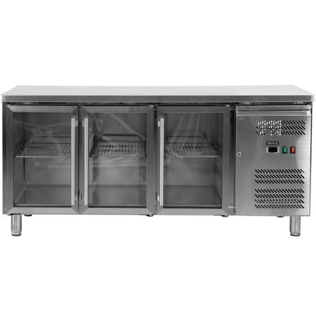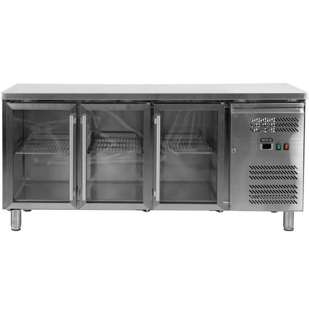 Chladicí stůl se 3 prosklenými dveřmi značky YATO - řada 700 o rozměrech pracovní desky 179,5x70 cm a nastavitelné výšce 85-91 cm. Objem 417 l. Vnitřní a vnější plášť je vyroben z nerezové oceli ss201, samozavírací dveře jsou vyrobeny z dvojitého tvrzeného skla, ke kterému jsou připevněny madla pro otevírání. Součástí vybavení jsou 3 police (každá na jedny dveře) o rozměrech 33x53 cm a nosnosti 40 kg každá. Chladicí komory jsou vybaveny LED osvětlením. Chladivo R290 je určeno pro provoz ve 4. klimatické třídě - při maximální okolní teplotě 30o C a relativní vlhkosti 55 %. Zařízení je vybaveno elektronickým ovladačem s digitálním displejem teploty.