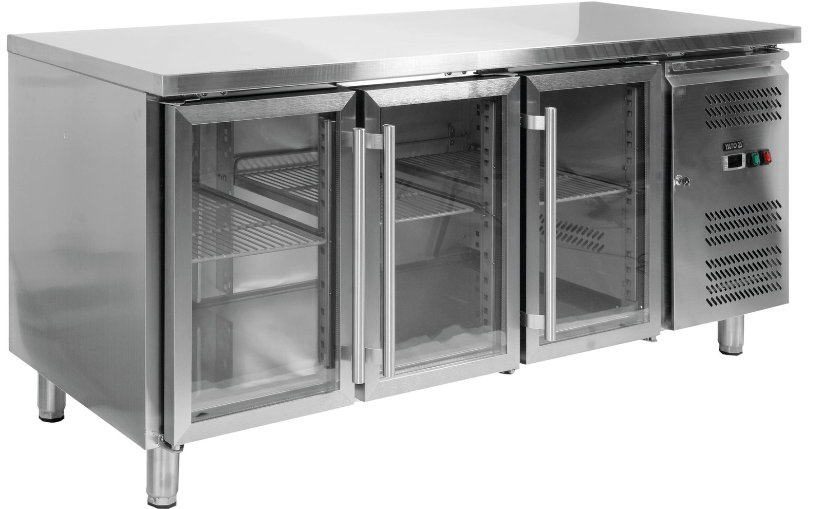 Chladicí stůl se 3 prosklenými dveřmi značky YATO - řada 700 o rozměrech pracovní desky 179,5x70 cm a nastavitelné výšce 85-91 cm. Objem 417 l. Vnitřní a vnější plášť je vyroben z nerezové oceli ss201, samozavírací dveře jsou vyrobeny z dvojitého tvrzeného skla, ke kterému jsou připevněny madla pro otevírání. Součástí vybavení jsou 3 police (každá na jedny dveře) o rozměrech 33x53 cm a nosnosti 40 kg každá. Chladicí komory jsou vybaveny LED osvětlením. Chladivo R290 je určeno pro provoz ve 4. klimatické třídě - při maximální okolní teplotě 30C a relativní vlhkosti 55 %. Zařízení je vybaveno elektronickým ovladačem s digitálním displejem teploty.