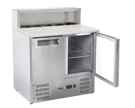 Chladicí stůl na pizzu, 2-dveřový s nástavbou, je profesionální chladicí zařízení, které se skvěle hodí do pizzerií, restaurací a gastronomických provozů. Vyniká odolnou konstrukcí z nerezové oceli a žulovou pracovní deskou, což zajišťuje pohodlnou přípravu pizzy i skladování surovin při optimální teplotě.