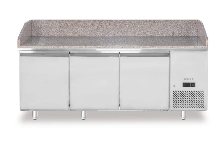Chladicí stůl na pizzu ARKTIC 220252 s třemi dveřmi je profesionální zařízení, které zajišťuje nejen efektivní chlazení surovin, ale také pohodlí při práci díky velké pracovní ploše z žuly. Pevná konstrukce a odolné materiály zaručují, že tento model je ideální volbou pro pizzerie, restaurace a gastronomické provozy, kde je důležitá vysoká výkonnost a hygiena při intenzivním používání.