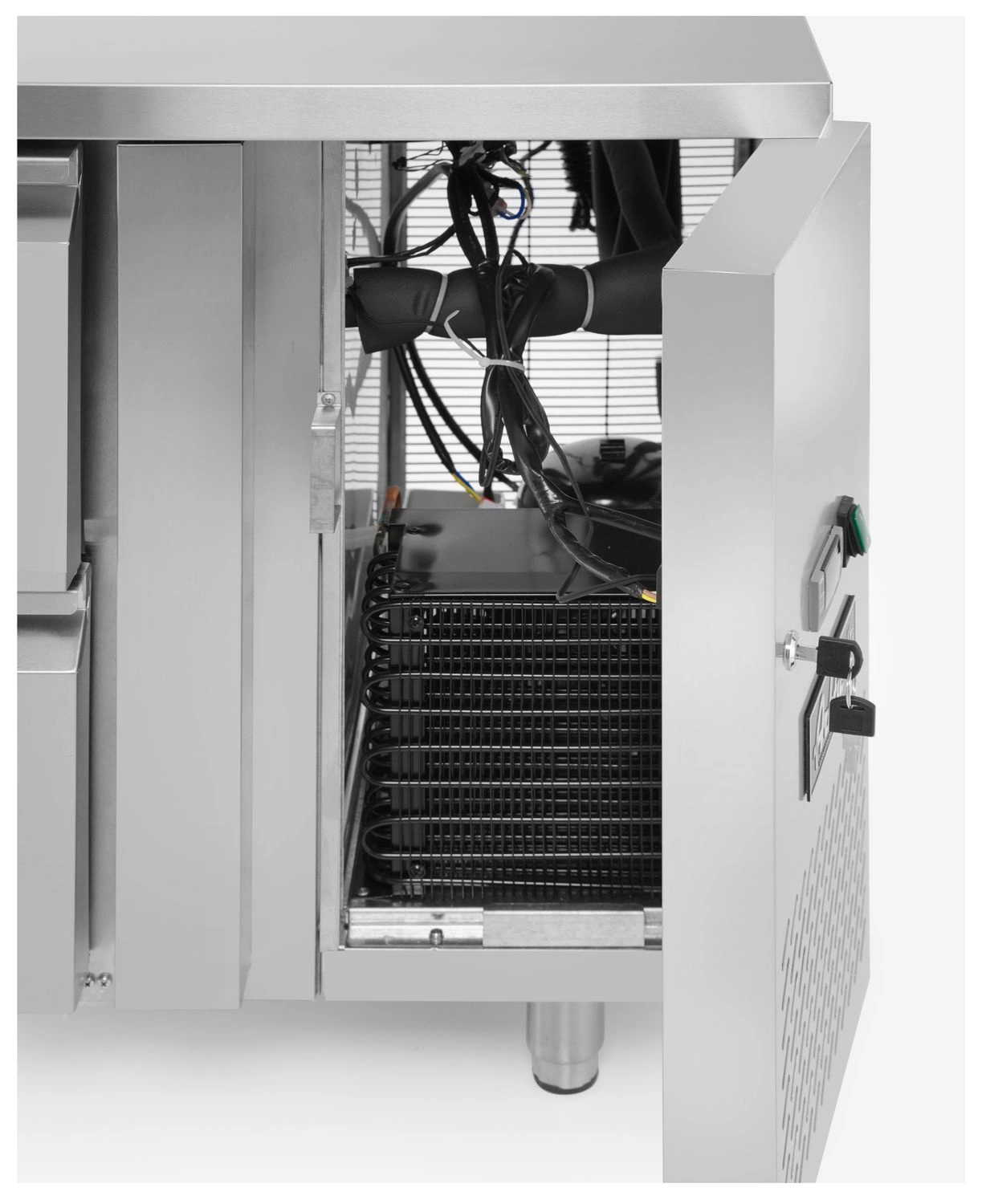 Chladicí stanice se 4 zásuvkami a boční jednotkou. Pouzdro je vyrobeno z nerezové oceli. Nucené chlazení, prachový filtr. Displej je digitální s elektronickým termostatem. Automatické odpařování kondenzátu. Může pracovat až do 43°C okolní teploty. Dvířka jsou samozavírací. Má 4 nešroubovací nerezové nótory, které jsou nastavitelné. Okraj je široký 4 cm.