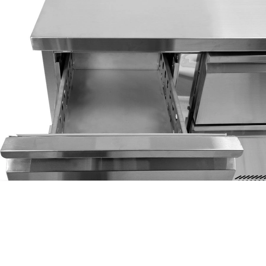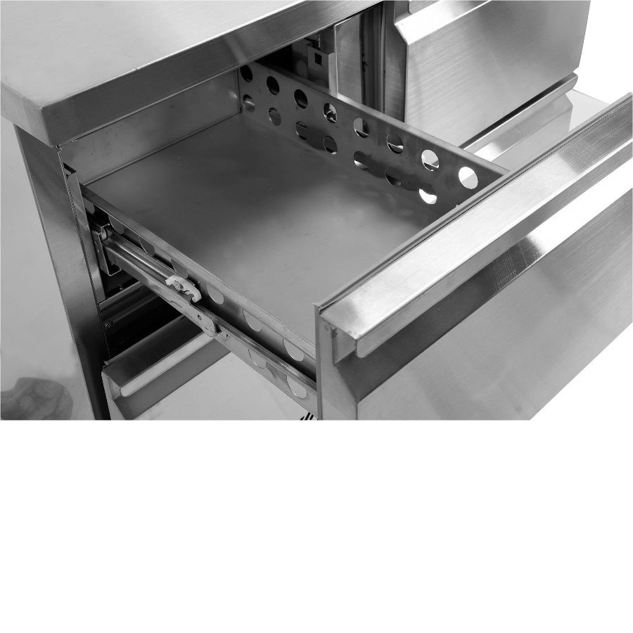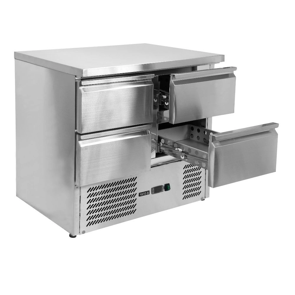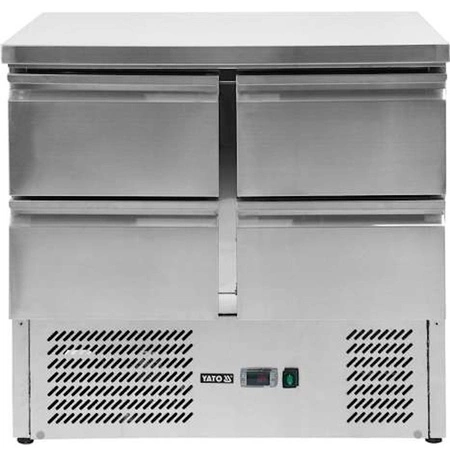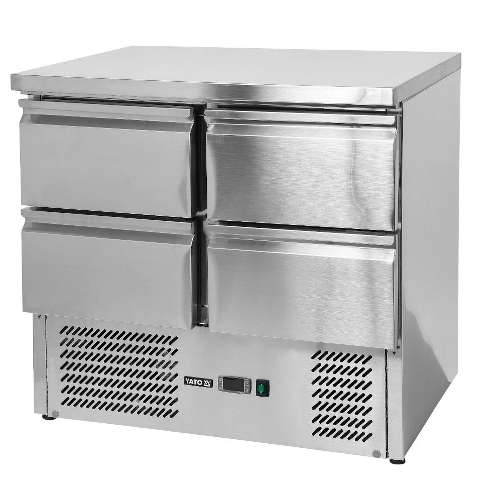 Chladicí stůl se 4 zásuvkami značky YATO – řada 700 o rozměrech 90x70x87 cm a objemu 220 l. Vnitřní a vnější plášť i pracovní deska jsou vyrobeny z vysoce kvalitní nerezové oceli SS201. Zásuvky pojmou GN 1/1 nádobu a lahve o maximální výšce 15 cm. Samozavírací zásuvky s pohodlnými úchyty.Chladicí agregát o výkonu 170 W využívá chladivo R600a, je určen pro provoz ve 4. klimatické třídě – při maximální okolní teplotě 30o C a relativní vlhkosti 55 %. Zařízení je vybaveno elektronickým ovladačem s digitálním displejem teploty.Cirkulace vzduchu je zajištěna ventilátorem, funkce automatického odmrazování. Teplotní rozsah +2 až 8 oC.