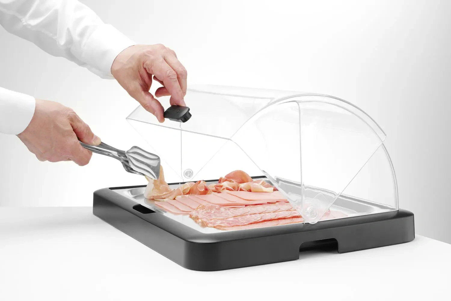 Chladicí tác s víkem. Vyrobeno z nylonu. Průhledné rolovací víko. Součástí je nerezový podnos a 2 chladicí prvky.
