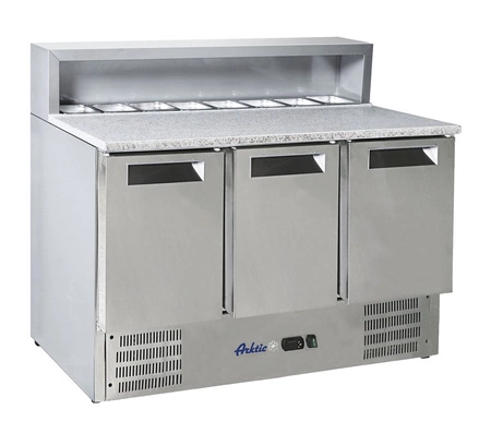 Třídveřová chladnička na salát Značka Arktic o celkovém objemu 368 l. GN 1/6 kontejnery, spodní montáž. Kryt z vysoce kvalitní nerezové oceli AISI 201. Žulová horní část. Statické chlazení s ventilátorem. Automatické odpařování kondenzátu pro udržení hygieny v jednotce. Digitální displej a elektronický termostat umožňují kontrolu a regulaci teploty.