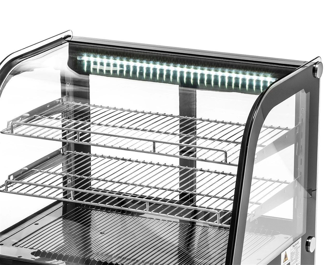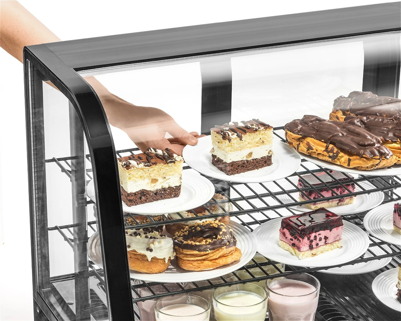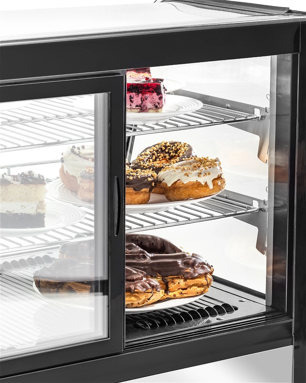 - Prosklený plášť – umožňuje prezentaci produktů ze všech stran, což přitahuje pozornost zákazníků a podporuje prodej. Ideální pro vystavování dortů, dezertů, nápojů či sendvičů.