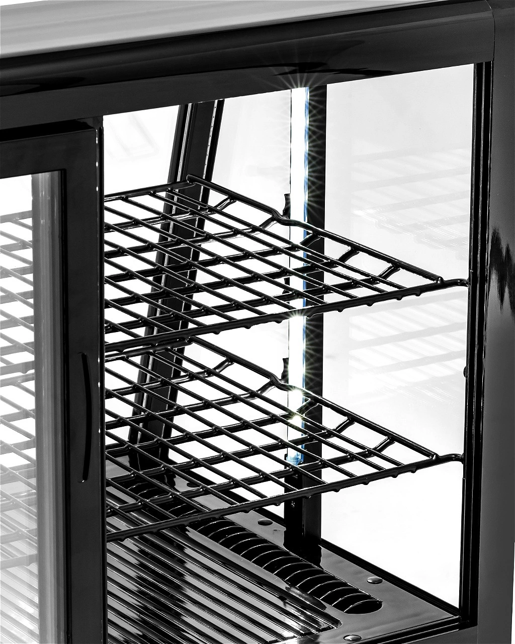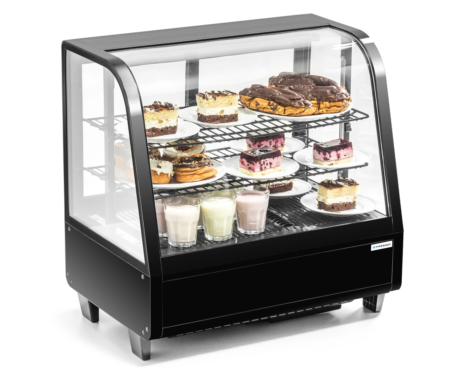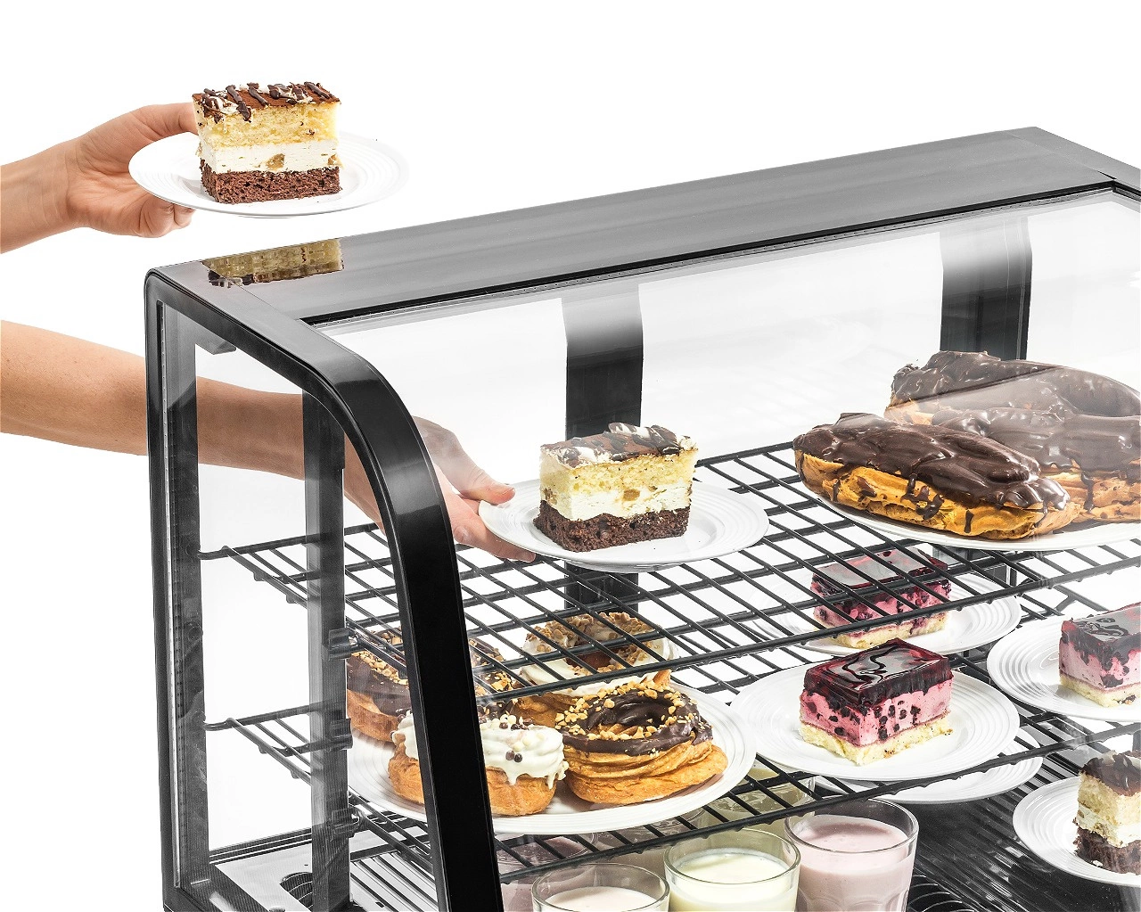- Prosklený plášť – umožňuje prezentaci produktů ze všech stran, což přitahuje pozornost zákazníků a podporuje prodej. Ideální pro vystavování dortů, dezertů, nápojů či sendvičů.