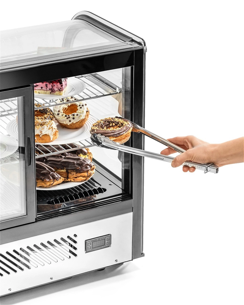Vitrína Forgast FG07741 byla navržena s ohledem na maximální funkčnost a estetiku. Černý, stylový plášť se skvěle hodí jak do moderních, tak i do klasických interiérů gastronomických provozů. Díky proskleným stěnám a úspornému LED osvětlení jsou produkty vystaveny způsobem, který přitahuje pozornost zákazníků. Dynamický chladicí systém s nucenou cirkulací vzduchu zajišťuje stálou teplotu na všech úrovních vitríny, takže i produkty uložené na horních policích zůstávají čerstvé. Vitrína je ideální do cukráren na prezentaci dortů a zákusků, do kaváren na vystavování sendvičů a dezertů či do restaurací na chlazení nápojů a předkrmů.