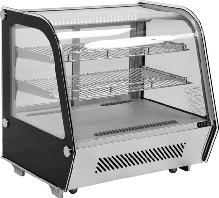 Chladicí vitrína expoziční prosklená ze 4 stran o objemu 120 l. Stříbrná barva. Vyrobena z vysoce kvalitních surovin. Ideální pro vystavování produktů jako jsou dorty, zákusky, mini občerstvení. Součástí jsou dvě potažené police s možností nastavení výšky, což umožňuje umístění produktů různých rozměrů. Přístup do vitríny je zajištěn pomocí posuvných skleněných dvířek, která jsou vyrobena z tvrzeného skla, stejně jako zaoblené přední sklo a boční skla – díky tomu jsou velmi odolná a mají dobré izolační vlastnosti. Vitrína je vybavena LED osvětlením, které umožňuje ještě atraktivnější prezentaci produktů.