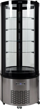 Kulatá chladicí vitrína o objemu 400 l. Vyrobena z vysoce kvalitních surovin. Ideální pro vystavování dortů a zákusků. Ve výbavě 4 police z tvrzeného skla s nastavitelnou výškou. Přístup do vitríny je možný pomocí skleněných dvířek z tvrzeného skla s funkcí samouzavírání. Vitrína je vybavena LED osvětlením. Chladicí agregát využívá chladivo R290. Zařízení má elektronický ovladač s digitálním displejem teploty. Vitrína má 4 nožky s vestavěnými kolečky – zašroubováním nožek vitrína spočine na kolečkách, což umožňuje její přesunutí na libovolné místo. Pokud však nožky vyšroubujete, vitrína stojí stabilně na podlaze a zůstává nehybná.