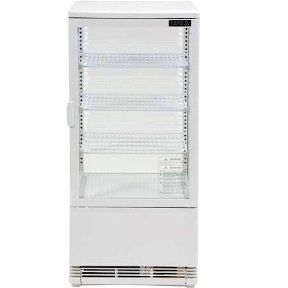Chladicí vitrína o objemu 78 l. Bílá barva. Vyrobena z vysoce kvalitních surovin. Ideální pro vystavování produktů jako jsou dorty, zákusky, mini občerstvení nebo různé druhy smoothie. Vybavena 3 zesílenými policemi potaženými PVC s nastavitelnou výškou uchycení. Přístup do vitríny je zajištěn skleněnými dvířky z dvouvrstvého tvrzeného skla, stejně jako čelní a boční skla. Vitrína má LED osvětlení ze 2 stran. Chladicí agregát využívá chladivo R600a. Zařízení je vybaveno elektronickým ovladačem s digitálním displejem teploty.