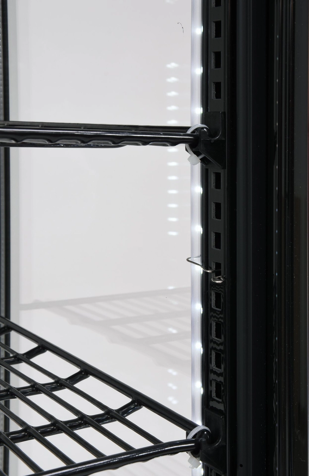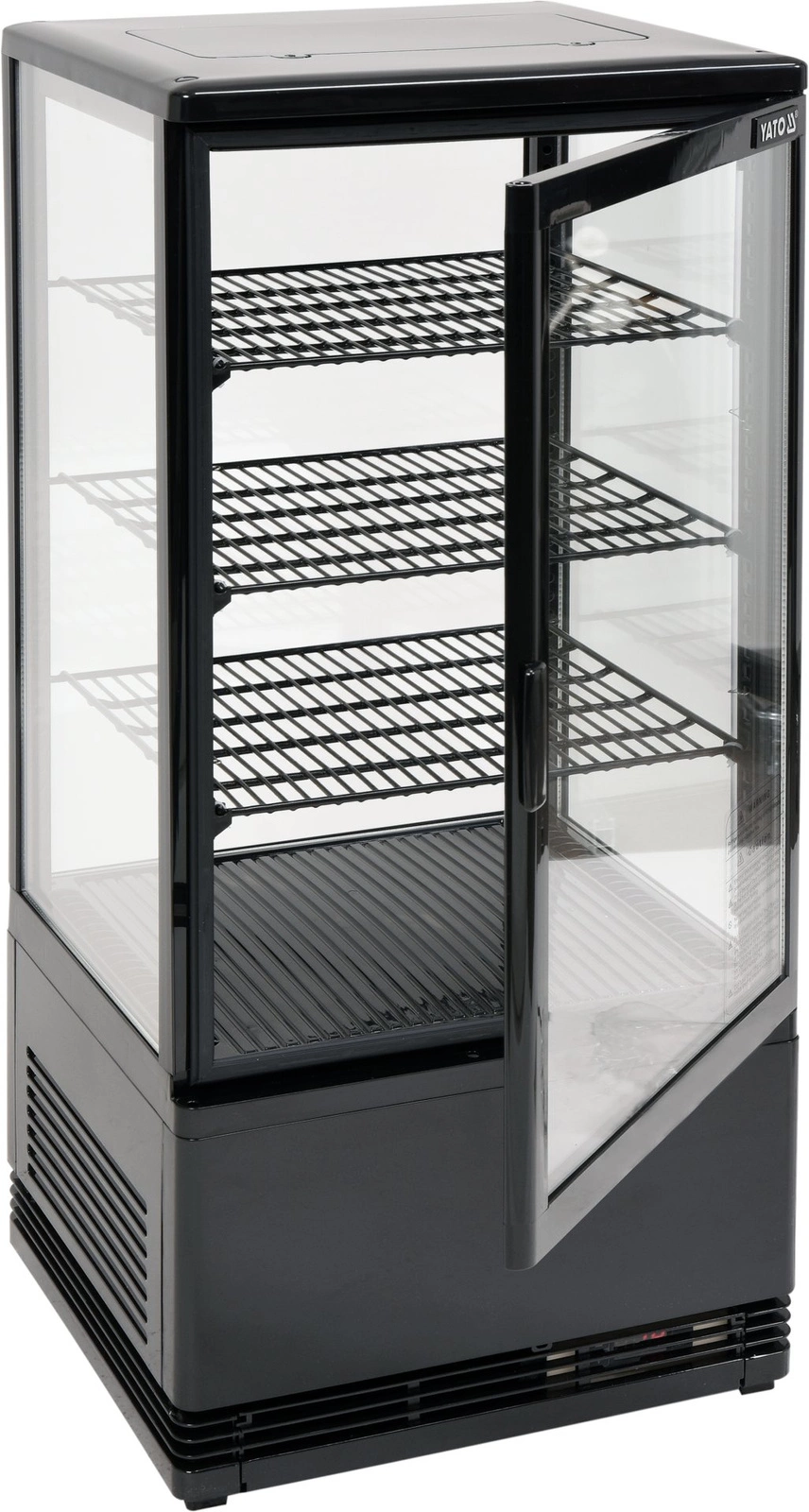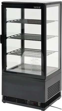 Chladicí vitrína o objemu 78 l. Černá barva. Vyrobena z vysoce kvalitních materiálů. Ideální pro vystavování produktů jako jsou dorty, zákusky, mini občerstvení nebo různé druhy smoothie. Součástí vybavení jsou 3 zesílené police potažené PVC s nastavitelnou výškou uchycení. Přístup do vitríny je umožněn skleněnými dvířky vyrobenými z dvouvrstvého tvrzeného skla, stejně jako čelní a boční skla. Vitrína je vybavena LED osvětlením ze 2 stran. Chladicí agregát využívá chladivo R600a. Zařízení má elektronický ovladač s digitálním displejem teploty.