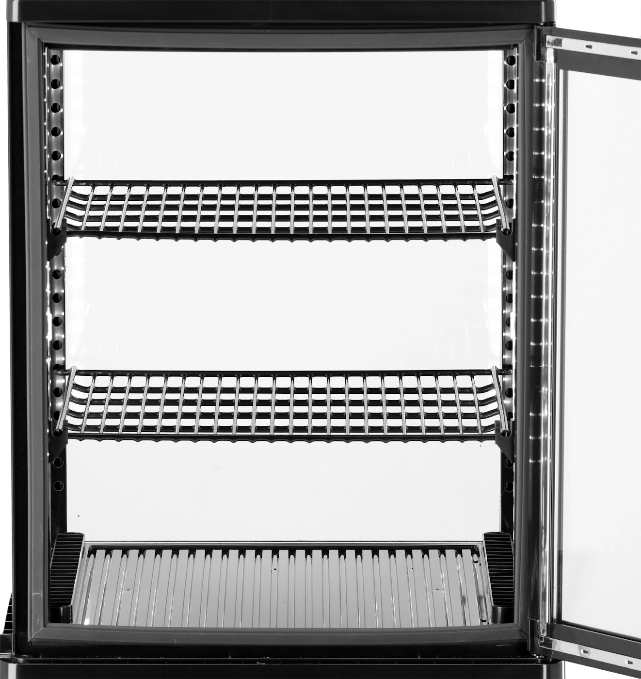 Kompaktní a stylová chladicí vitrína o objemu 59 litrů je vynikajícím řešením pro vystavení nápojů, dezertů nebo jiných produktů vyžadujících chlazení. Díky elegantnímu černému provedení a dvojitému tvrzenému sklu se zařízení skvěle hodí jak do gastronomických provozů, tak do obchodů či kanceláří.