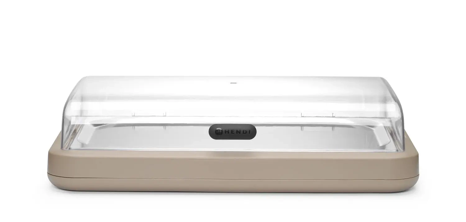 Chladicí vitrína UNIQ GN 1/1 hnědá HENDI byla navržena s ohledem na maximální funkčnost v gastronomickém prostředí. Je vybavena otevíracím víkem typu roll-top, které chrání pokrmy před vysycháním a znečištěním a zároveň umožňuje pohodlný přístup při servírování. Plášť z odolného polypropylenu a průhledného ABS zajišťuje trvanlivost a estetiku produktu. Součástí sady je nerezový tác GN 1/1 a chladicí vložka naplněná gelem, která umožňuje udržet nízkou teplotu pokrmů po delší dobu – ideální řešení pro dlouhé akce, bankety nebo snídaně formou bufetu.