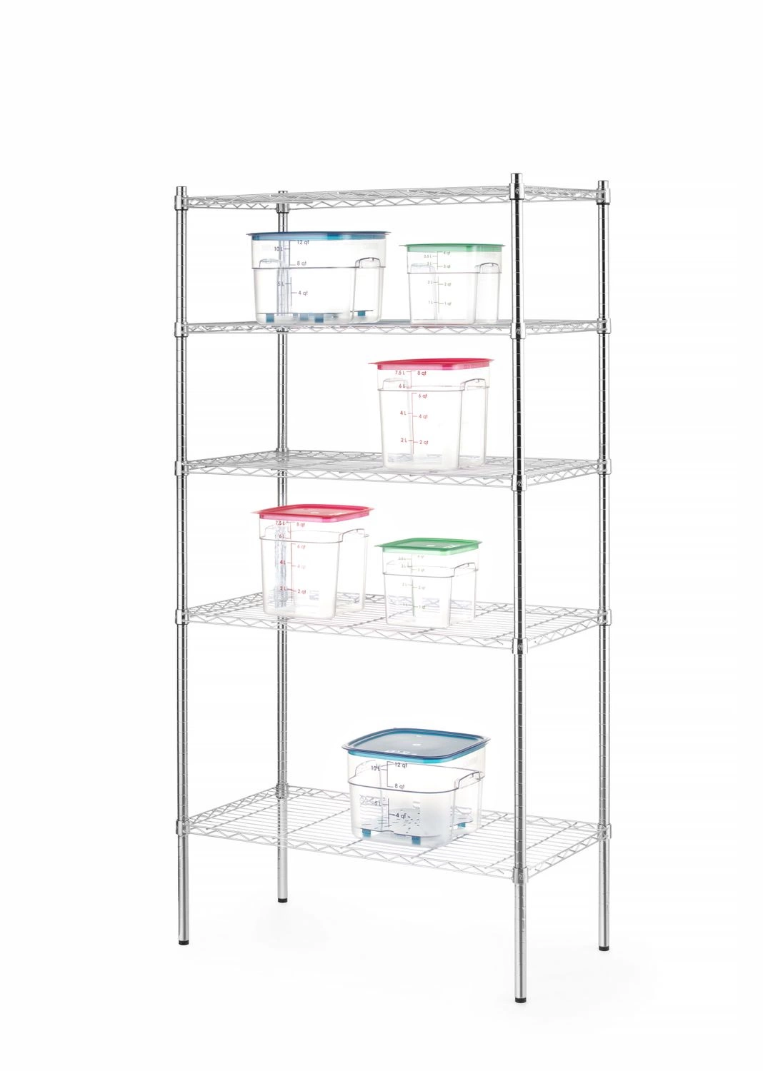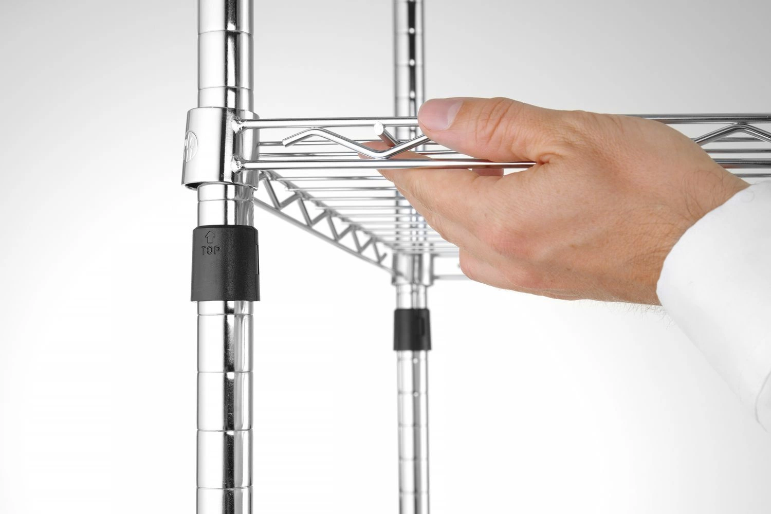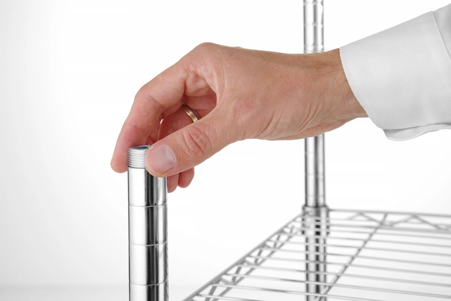 Chromovaný úložný regál Je vybaven pěti nastavitelnými nožičkami s maximální nosností 80 kg. Regál se dodává v plochém balení pro vlastní montáž.