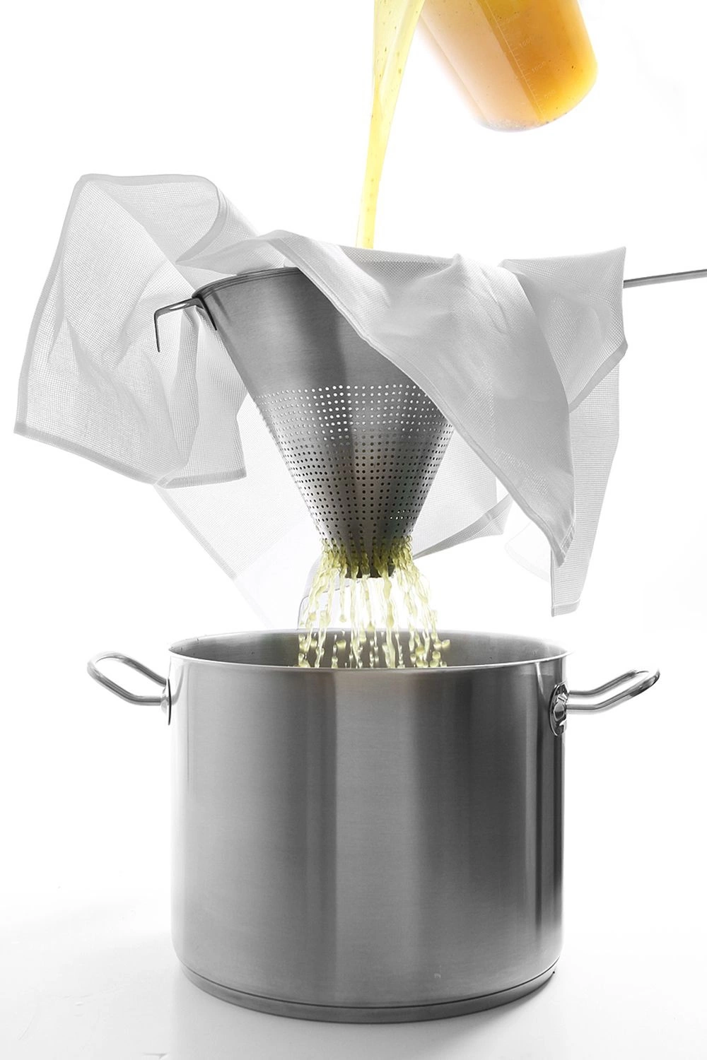 Čínské síto s přídavnou rukojetí, kónická. Průměr 23,5 cm.