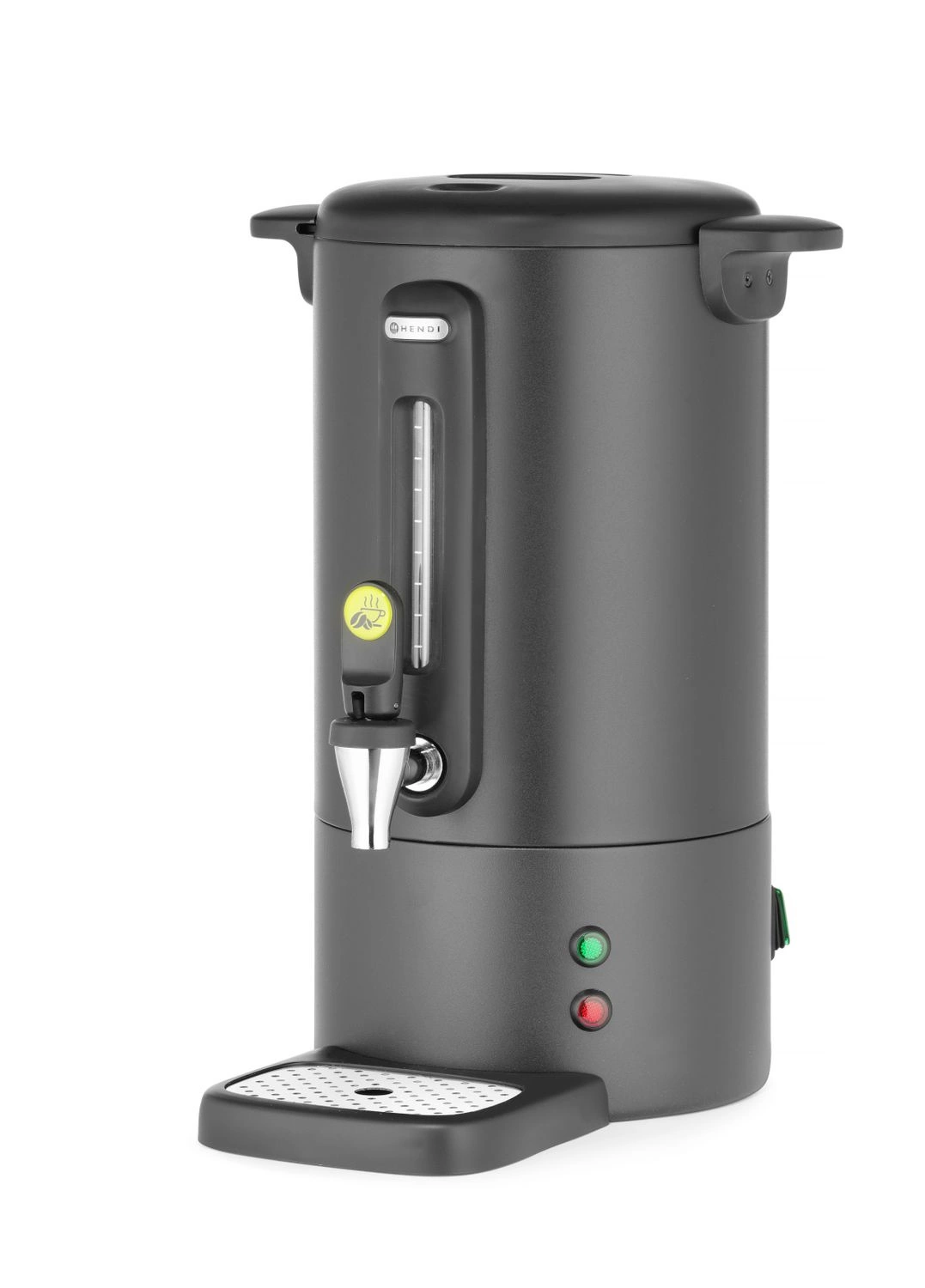 7litrový kávovar Concept Line. . Tělo z nerezové oceli potažené matnou černou barvou. Víko a rukojeti z polypropylenu. Varná konvice je vybavena kohoutkem bez odkapávání a skleněným ukazatelem hladiny vody. Světelný indikátor vás informuje o ukončení ohřevu a o nutnosti sejmout vodní kámen. Díky vestavěnému filtru na hrubě mletou kávu není třeba používat filtrační papír. Kávovar udržuje teplotu kávy.