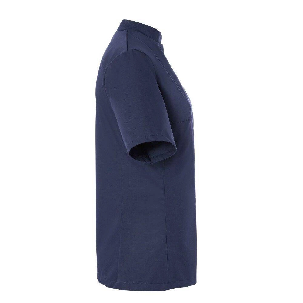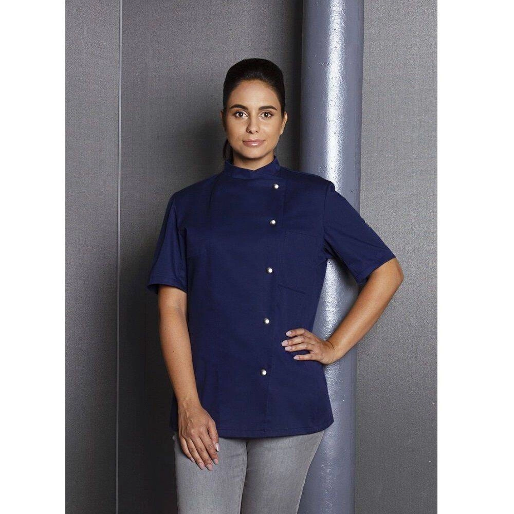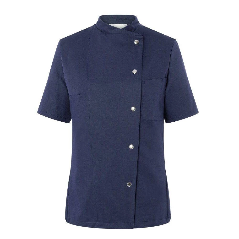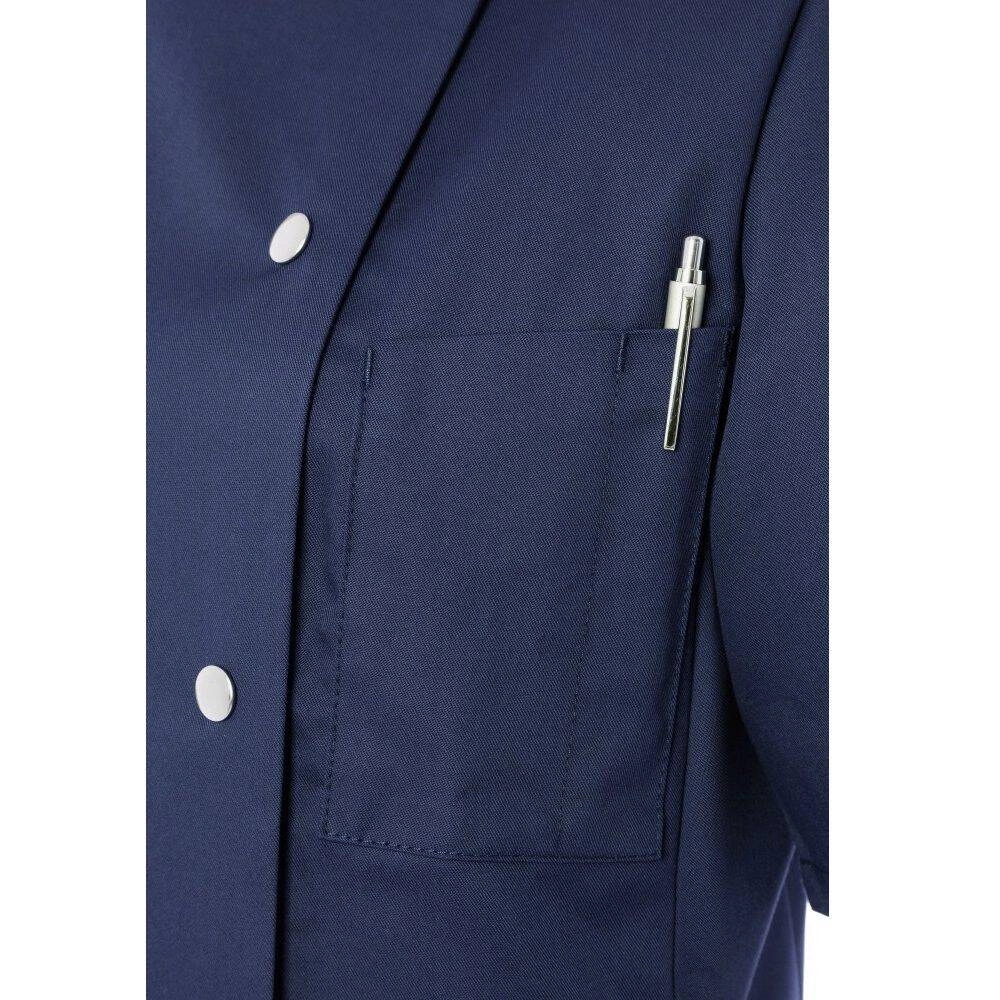 Dámskákuchařská halenka Greta od značky Karlowsky. Námořnická modrá barva. Vyrobeno z 65 % polyesteru a 35 % bavlny. Keprová vazba. Vypasovaná kuchařská blůza s krátkými rukávy. Přiléhavý střih zajišťují záševky na prsou a boční švy na přední a zadní straně mikiny. Na levé straně na hrudi je kapsa. Mikina se zapíná na 5 knoflíkóů a patentky. Lze ji prát průmyslově. Nebělit. Dostupné velikosti od 34 do 50.