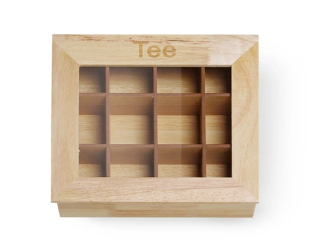Dřevěný stojan na čaj. 12 přihrádek. Víko s akrylovým okénkem.