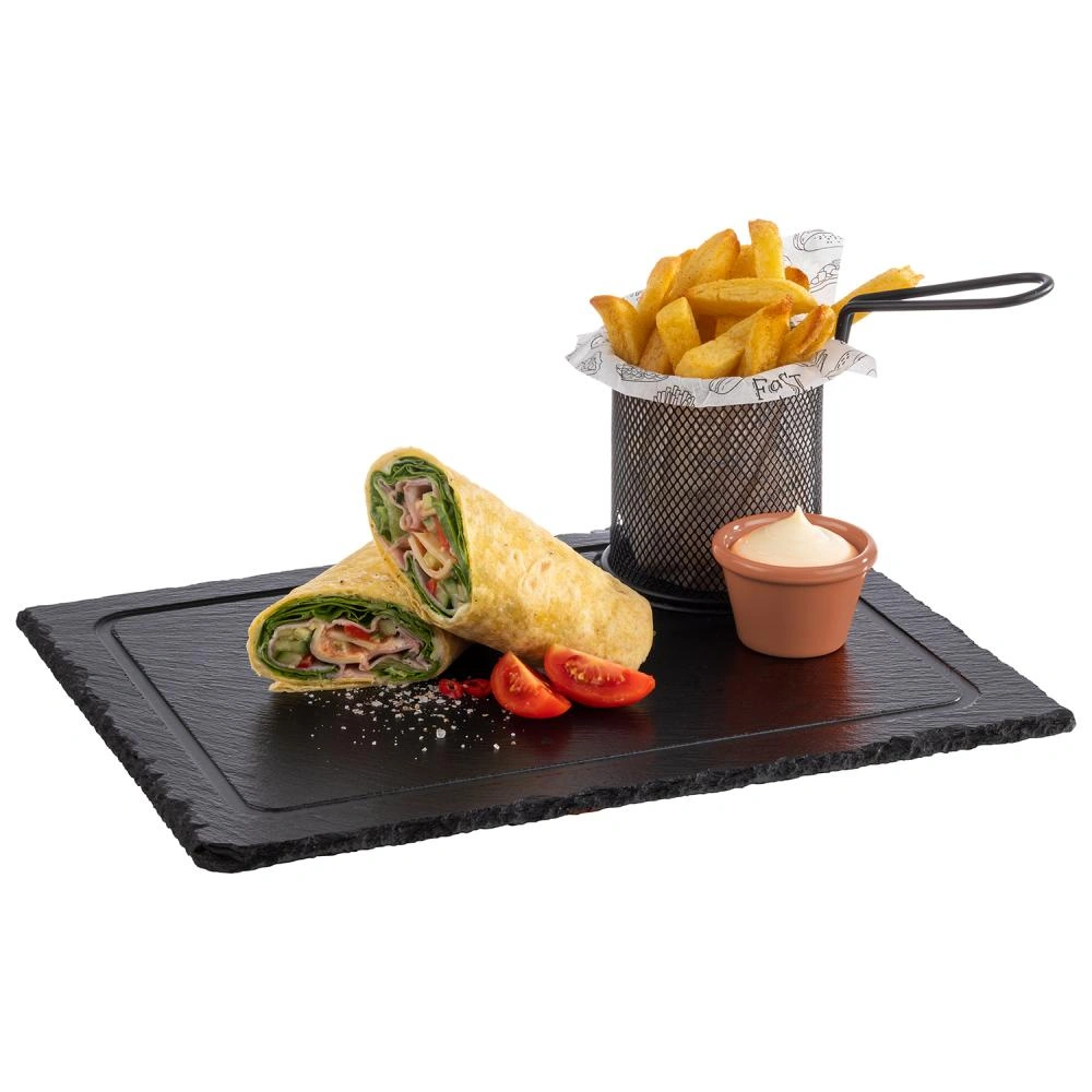 Břidlicová deska MORRA je elegantní a funkční prvek vybavení pro gastronomii i domácnost. Díky přírodní břidlici a nepravidelným okrajům je produkt ideální pro servírování jídel, předkrmů nebo sýrů – zdůrazňuje jejich jedinečný charakter. Deska je vybavena protiskluzovými nožičkami, které chrání povrch stolu.