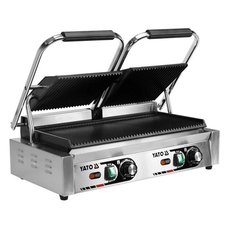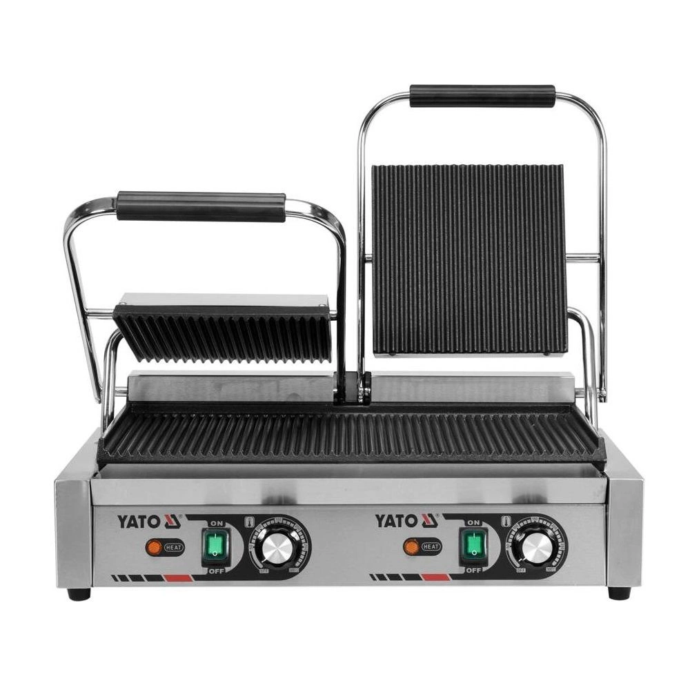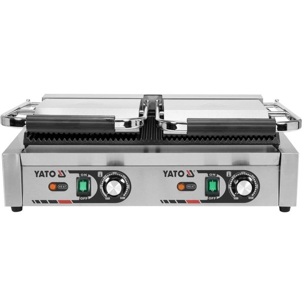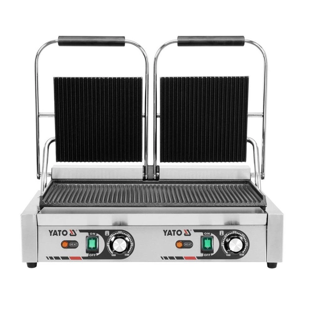 Kontaktní gril YATO pod značkouóy o rozměrech 58x36x19 cm. Je určen pro rychlou přípravu hamburgerůómasa, ryb, tortill, toastůónebo zeleniny. Vyroben z vysoce kvalitní nerezové oceli. Mastný žlábek na přední straně desky a speciální kapkovitý otvor usnadňují čištění. Litinová grilovací deska o rozměrech gór desky 48x23 cm je vynikajícím nástrojem, který dokáže smažit více produktů najednou z obou stran. Na góru jsou dvě nezávislé desky. Díky své vlnité struktuře na horní i spodní straně zaručuje tato varná deska rovnoměrné a efektivní vaření. Výkonné topné těleso 3,6 kW je ovládán 2 nezávislými potenciometryóumístěnými na předním panelu. Teplotu je možné nastavit v rozmezí 50~300ºC.