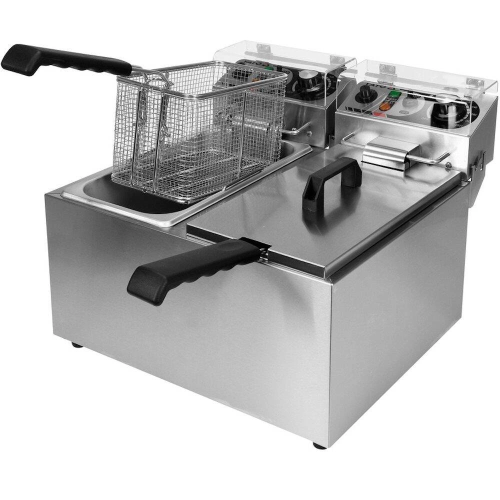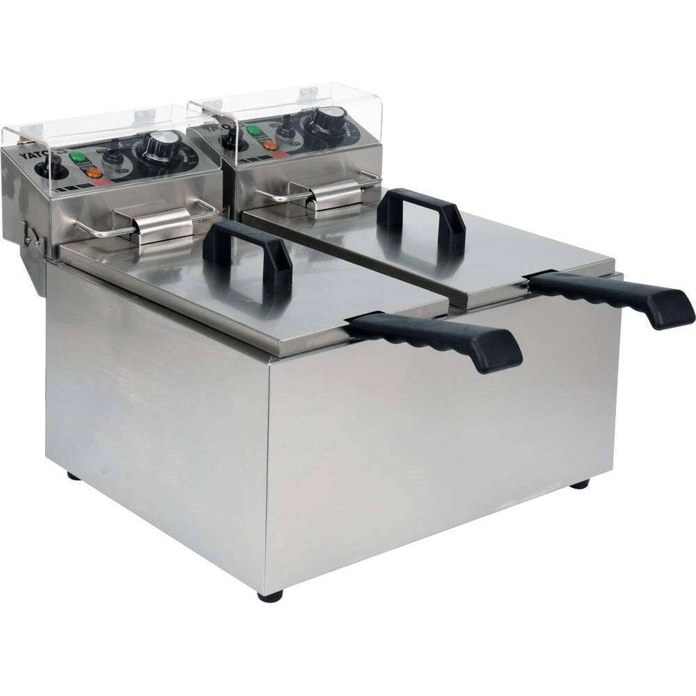 Dvoukomorová fritéza o objemu 2x5L značky YATO. Je určena k fritování v hlubokém oleji: hranolků, masa, ryb, krokety, zeleniny. Nádoby fritézy mají celkový objem 8L. Minimální hladina oleje je 3,2L a maximální 5L.