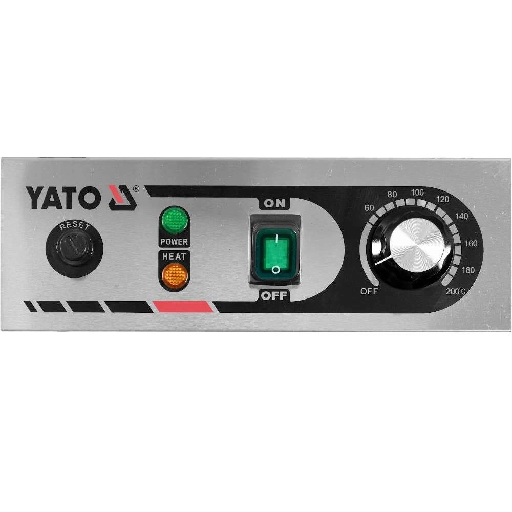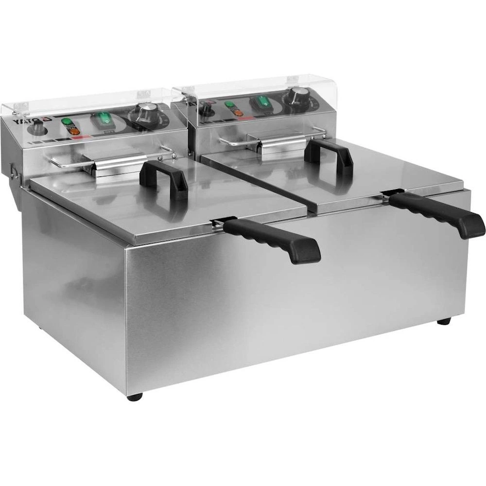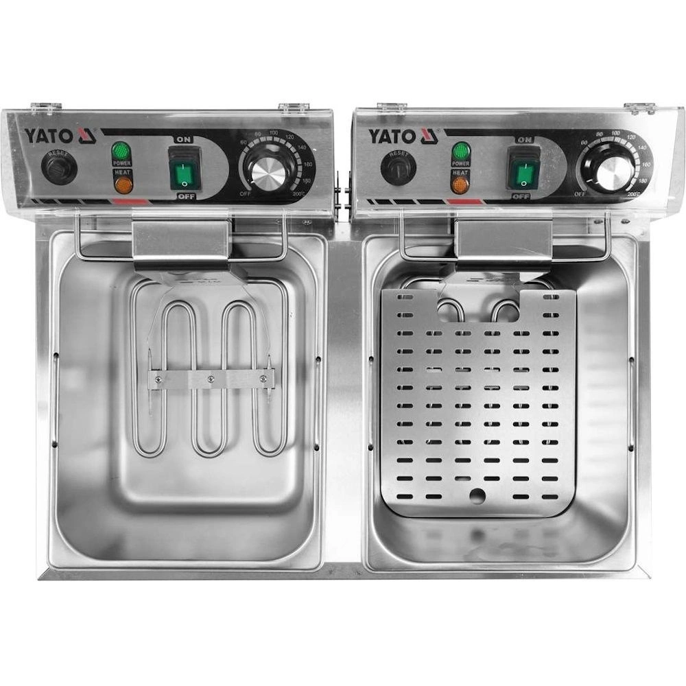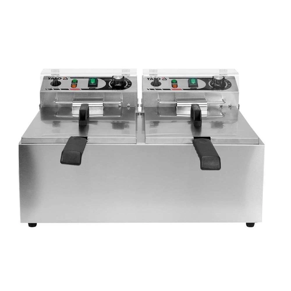 Dvoukomorová fritéza o objemu 2x8L značky YATO. Je určena pro smažení v hlubokém tuku: hranolky, maso, ryby, krokety, zelenina. Nádoby fritézy mají celkový objem 13L. Minimální hladina oleje je 5,2L a maximální 8L.